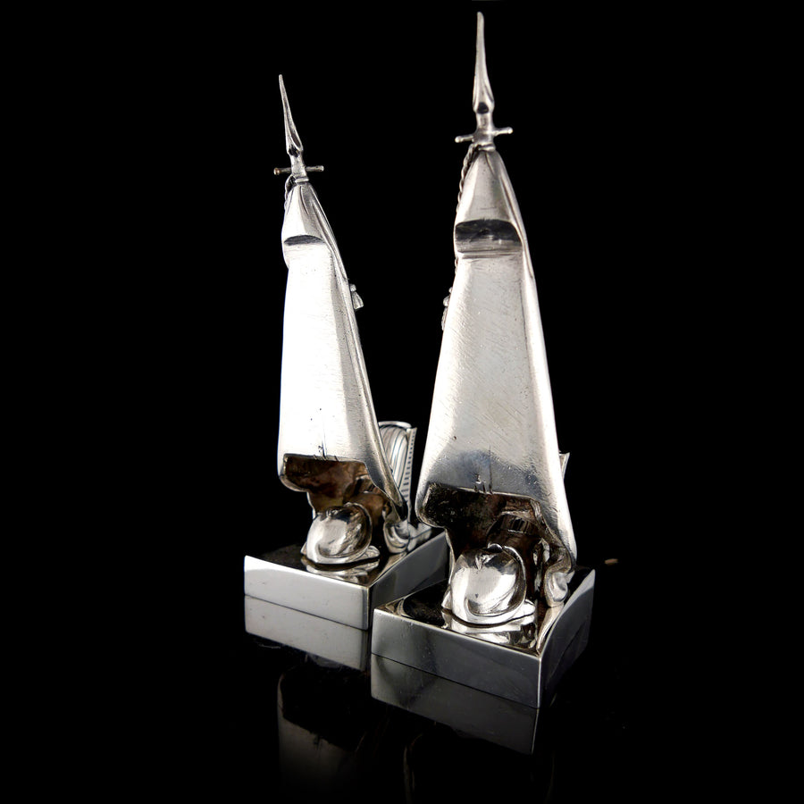 Paktong (nickel silver). A pair of 19th century ornaments, possibly parts of a large table centrepiece, in the form of two Egyptian sphinx, each bearing a Colour, with pre-1852 style spike finials, one inscribed with battle honours from the French Revolutionary and Napoleonic Wars, and the other from the Sikh Wars (1845-47) as won by the 50th (Queen's Own) Regiment of Foot), later amalgamated with the 97th Foot to become The Queen’s Own (Royal West Kent Regiment) in 1881.