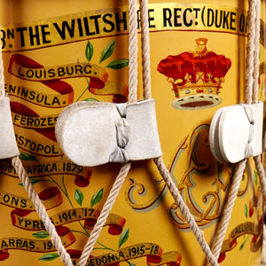 Wiltshire Regiment presentation side drum with brass cylinder, rope tensioning system, leather tabs; the cylinder stamped with maker’s name of Butler of Haymarket, London and Dublin, and ‘Renovated / & Heraldry by / George Potter & Co / Aldershot’; the regimental emblazon with Battle Honours from South Africa to Palestine 1917-18.