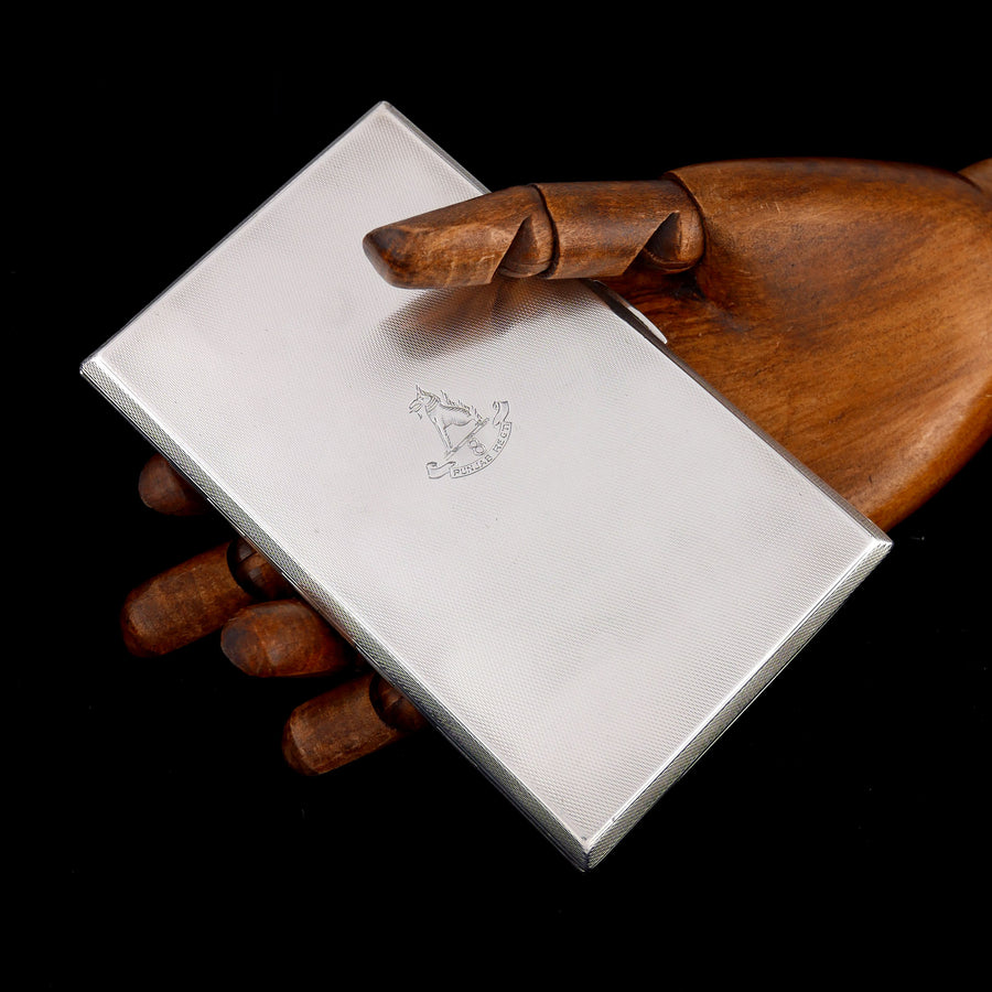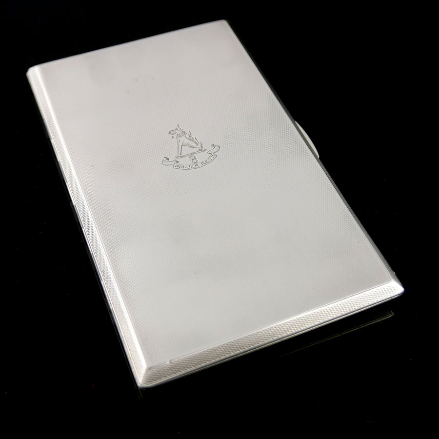 Silver. Rectangular case with engine turned decoration, the sprung hinged lid engraved with the 8th Punjabis regimental badge of a chinthe. Gilt interior inscribed ’27/11/45’. Maker’s mark of Dudley Russell Howitt. Hallmarked 1944.