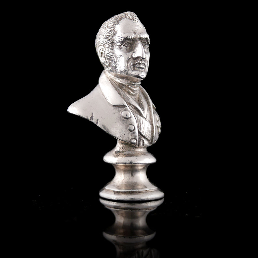 Silver. Solid cast miniature bust of Arthur, 1st Duke of Wellington in civilian dress with breast star caricature features, possibly designed for use as a pipe tamper, and as one of a pair to a known companion Napoleon bust. Hallmarked London 1905.