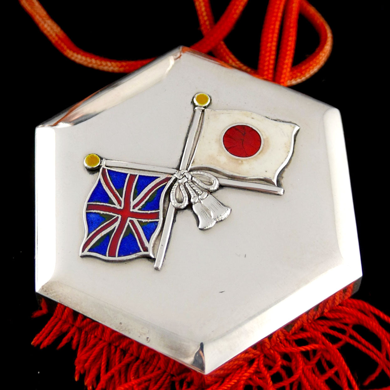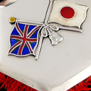 Silver and enamels. Hexagonal form Japanese presentation silver box, the lift off cover applied with crossed Union Jack and Rising Sun flags, the sides tied with red cord. Marked ‘Sterling’ to the base and impressed with maker’s name of Miyamoto.