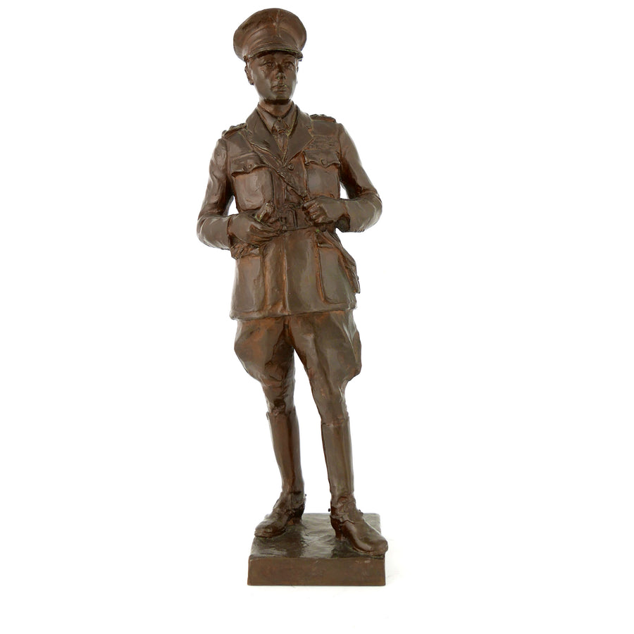 Patinated bronze. Standing figure of the prince in Welsh Guards field service dress. Signed for the founder ‘Elkington & Co’ and the sculptor ‘Sydney March / 1921'.