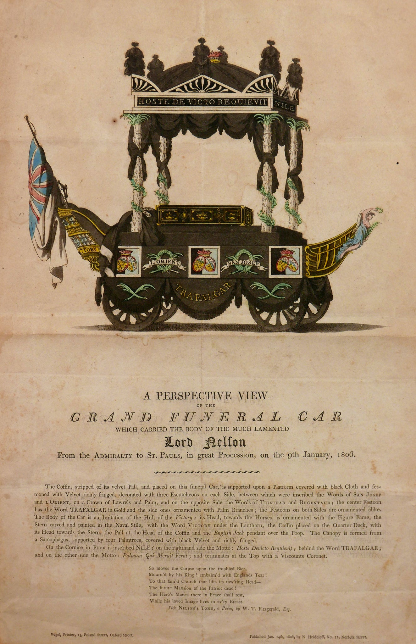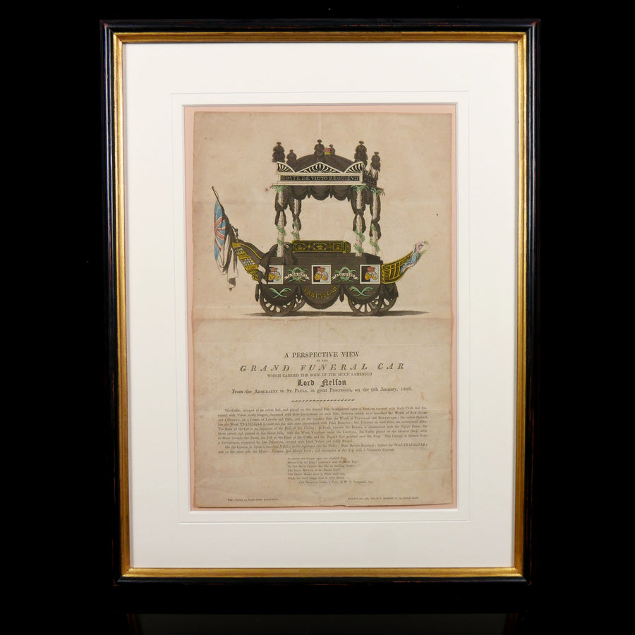 Inscribed - ’The Coffin, stripped of its velvet Pall and placed on this funeral Car, is supported upon a Platform covered with black cloth and festooned with Velvet richly fringed, decorated with three Escutcheons on each side, between which were inscribed the WORDS of SAN JOSEF and L’ORIENT, on A Crown of Laurels and Palm, and on the opposite Side the Words of TRINIDAD AND BUCENTAUR; the centre Festoon has the Word TRAFALGAR in Gold and the side ones ornamented with Palm Branches; the Festoons on both Sides are ornamented alike. The Body of the Car is an Imitation of the Hull of the Victory, its Head toward the Horses, is ornamented with the Figure Fames, the Stern carved and painted in the Naval Stile, with the Word VICTORY under the Lanthorn [lantern], the Coffin placed on the Quarter Deck, with its Head towards the Stern [rear of a vessel], Pall at the Head of the Coffin and the English Jack pendant over the Poop. The Canopy is formed from a Sarcophagus, supported by four Palm Trees, covered with black Velvet and richly fringed.’