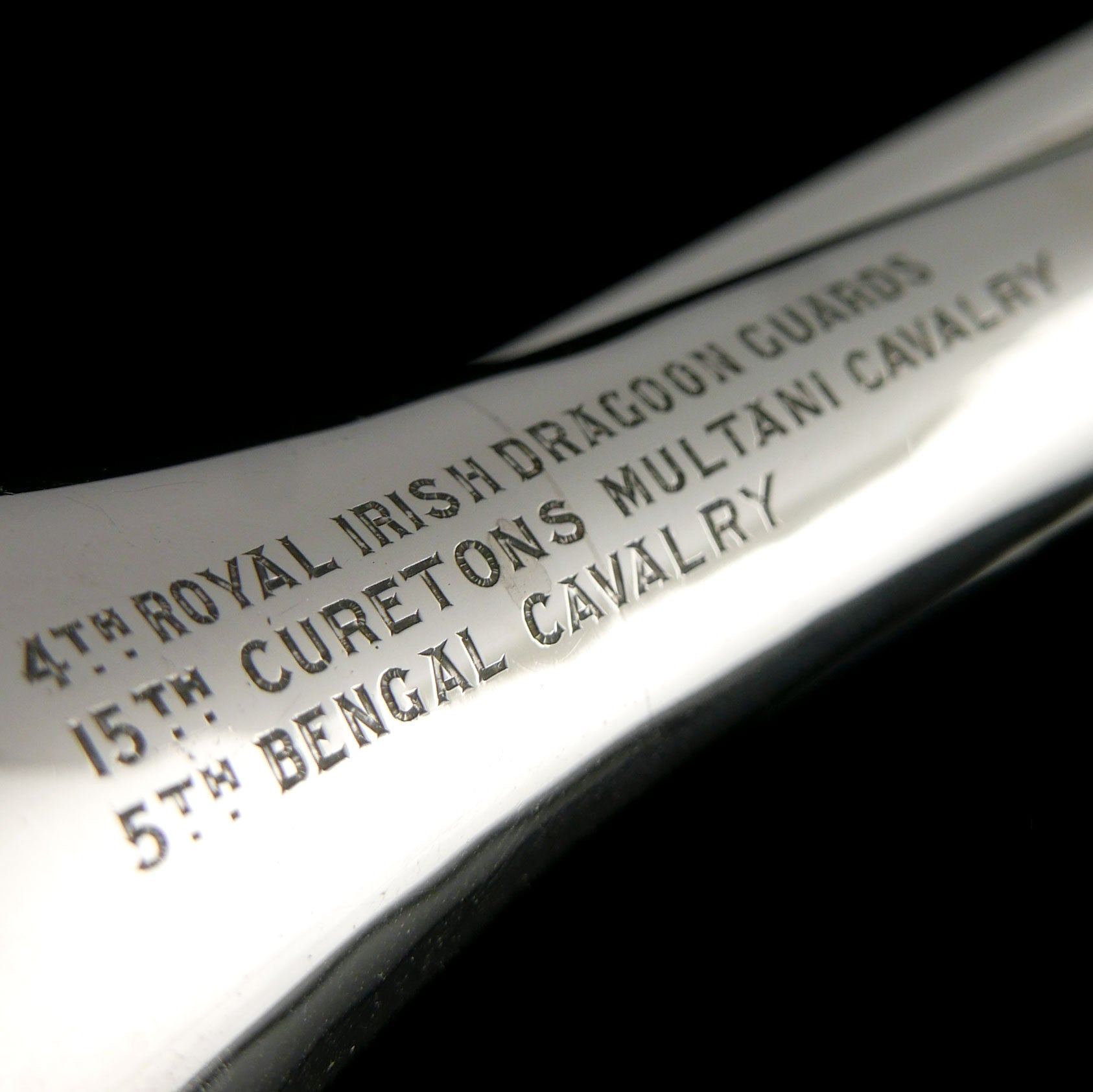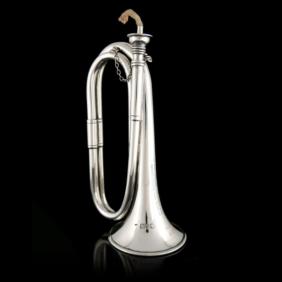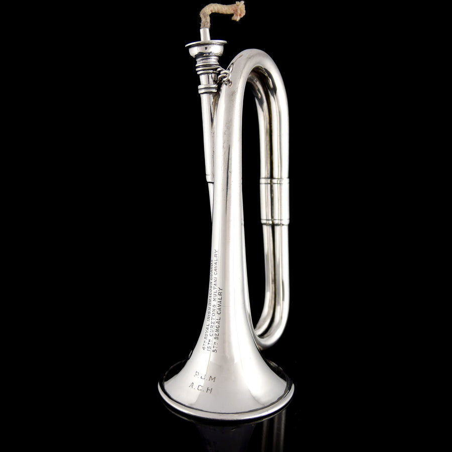 Silver. In the form of a bugle with wick fed by a fuel reservoir within, inscribed ‘4TH ROYAL IRISH DRAGOON GUARDS / 15TH CURETONS MULTANI CAVALRY / 5TH BENGAL CAVALRY