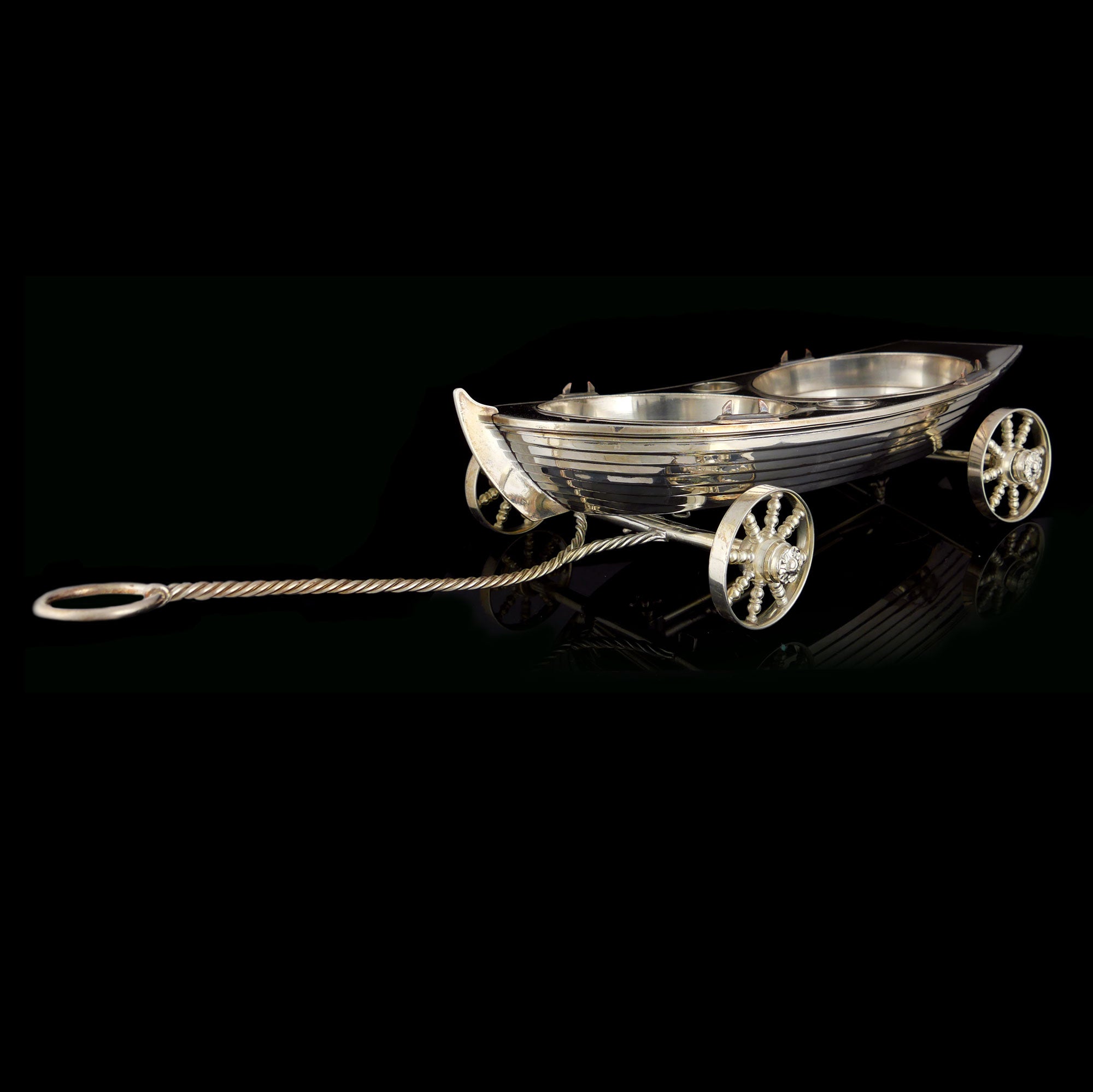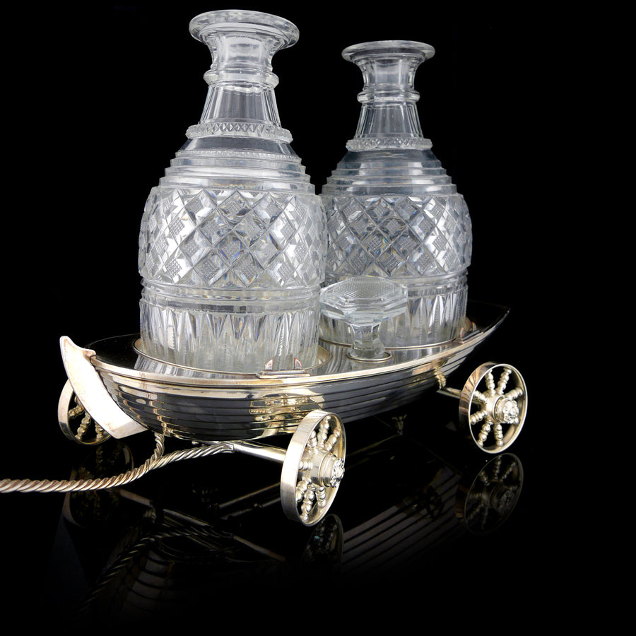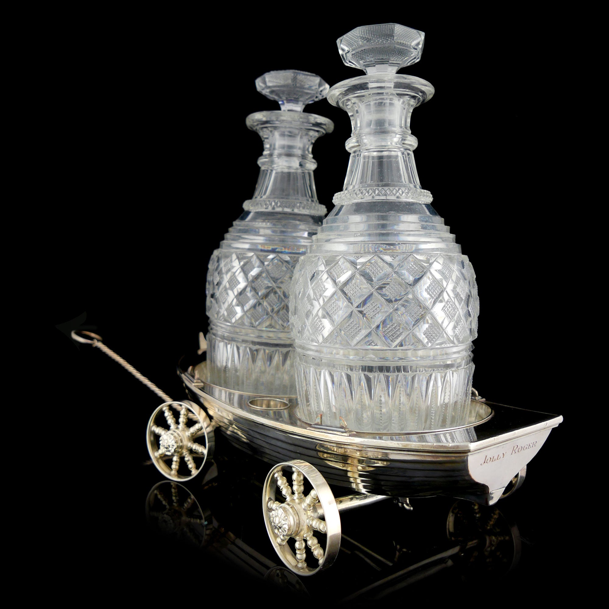 Silver on copper. A double decanter stand in the form of clinker-built jolly boat, inset with circular recesses for decanters and stoppers, fitted with a wheeled carriage and rope twist attachment for ease of movement around the dining table. The transom engraved with ‘Jolly Roger’. Complete with a pair of George III cut glass decanters with stoppers.