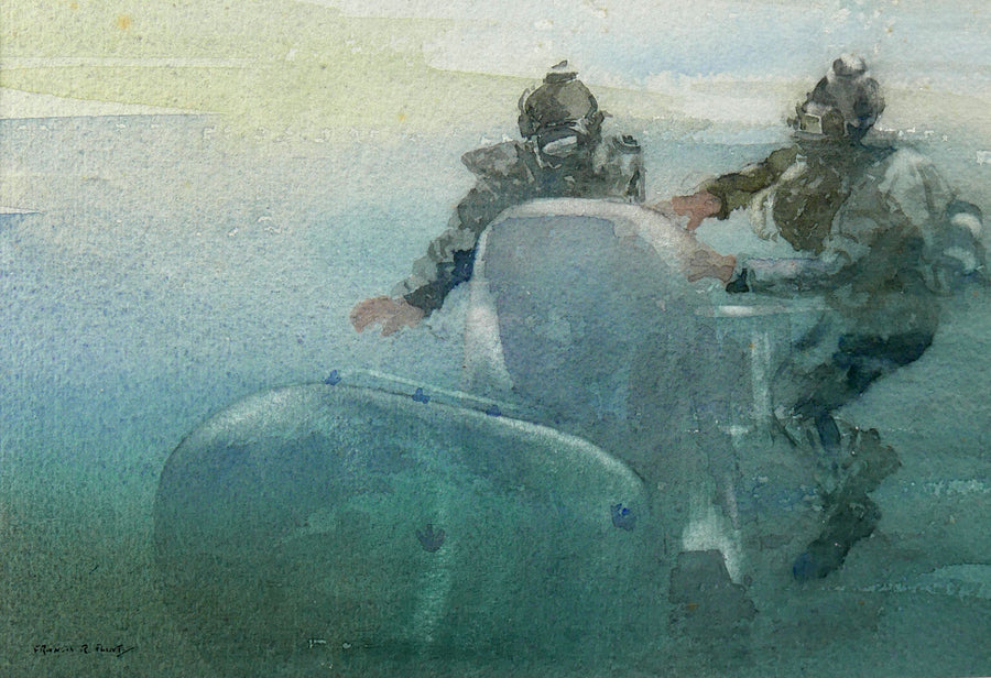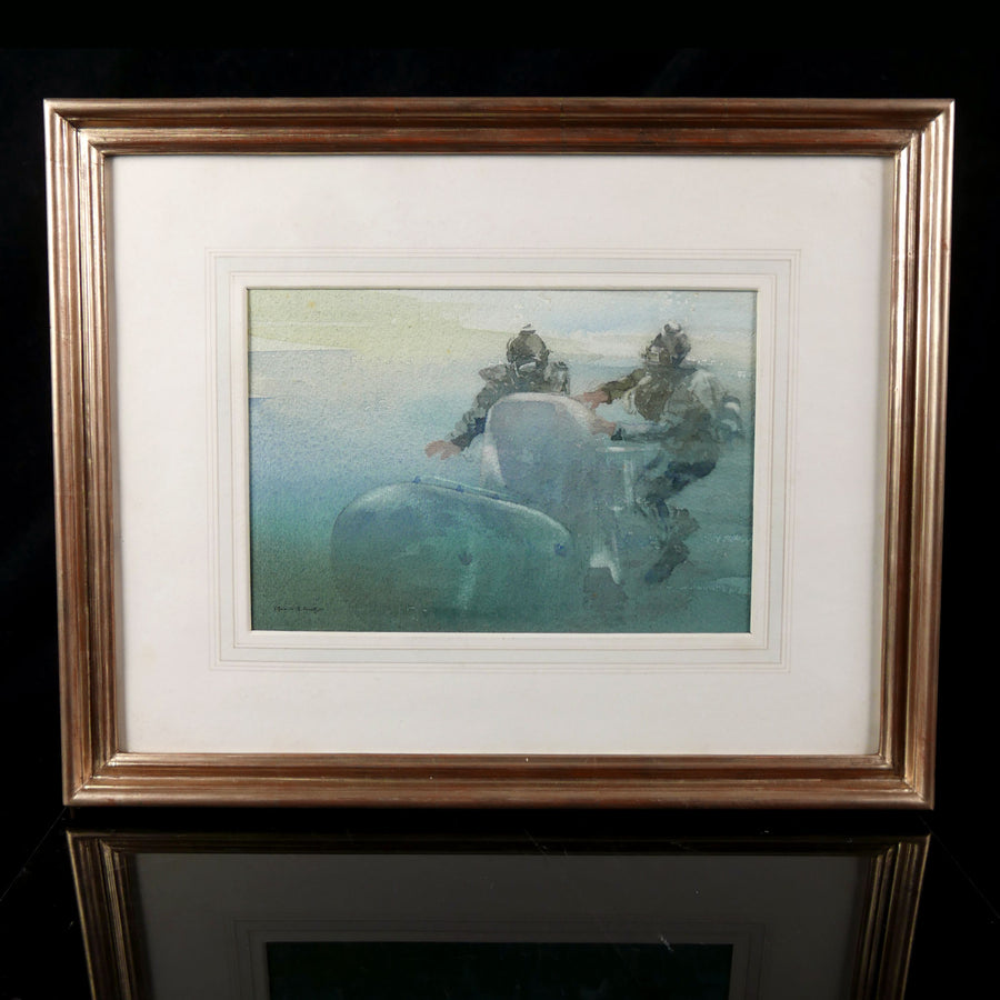 Watercolour on paper. Royal Navy ‘charioteers’ in Sladen Suits with Mk I Chariot. Signed lower left ‘Francis R. Flint’. Watercolour: 16.5cm x 24.5cm. Framed and glazed.