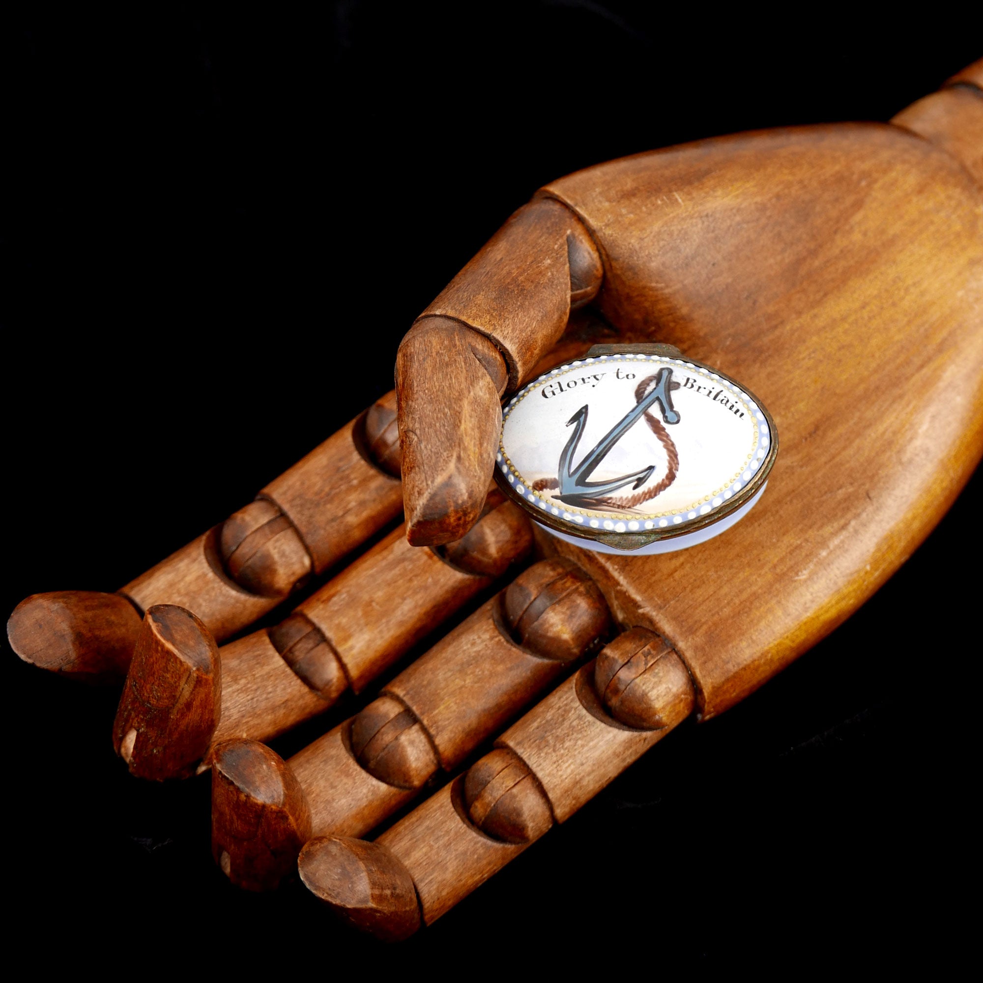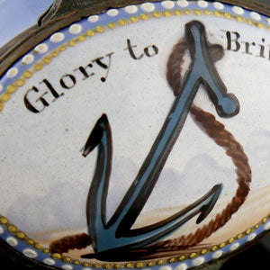 Enamel on copper. Of ovoid form, the hinged lid with mirror to the interior, decorated with an anchor, and the legend ‘Glory to Britain’. Pale blue enamel base. Produced in south Staffordshire.