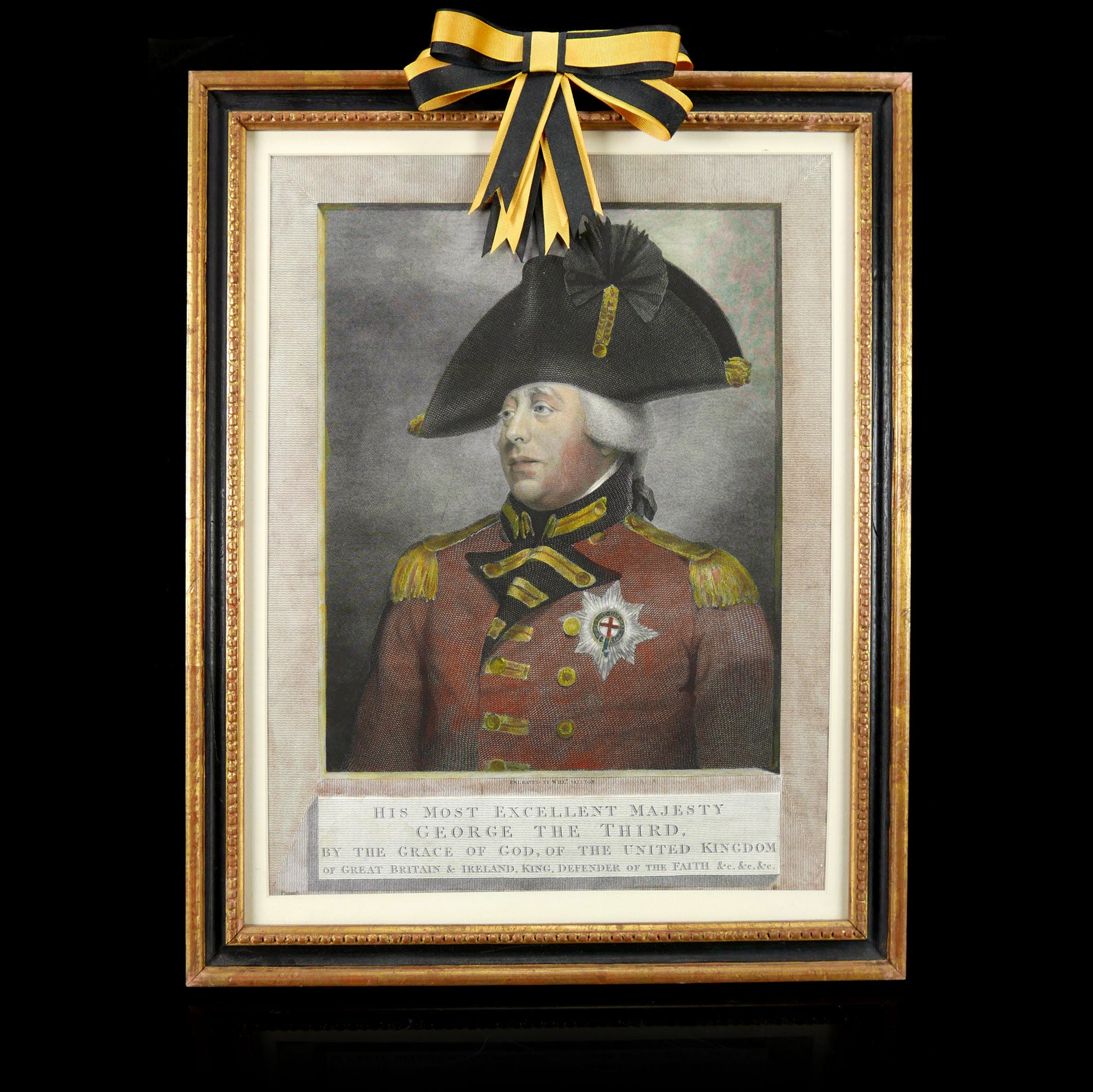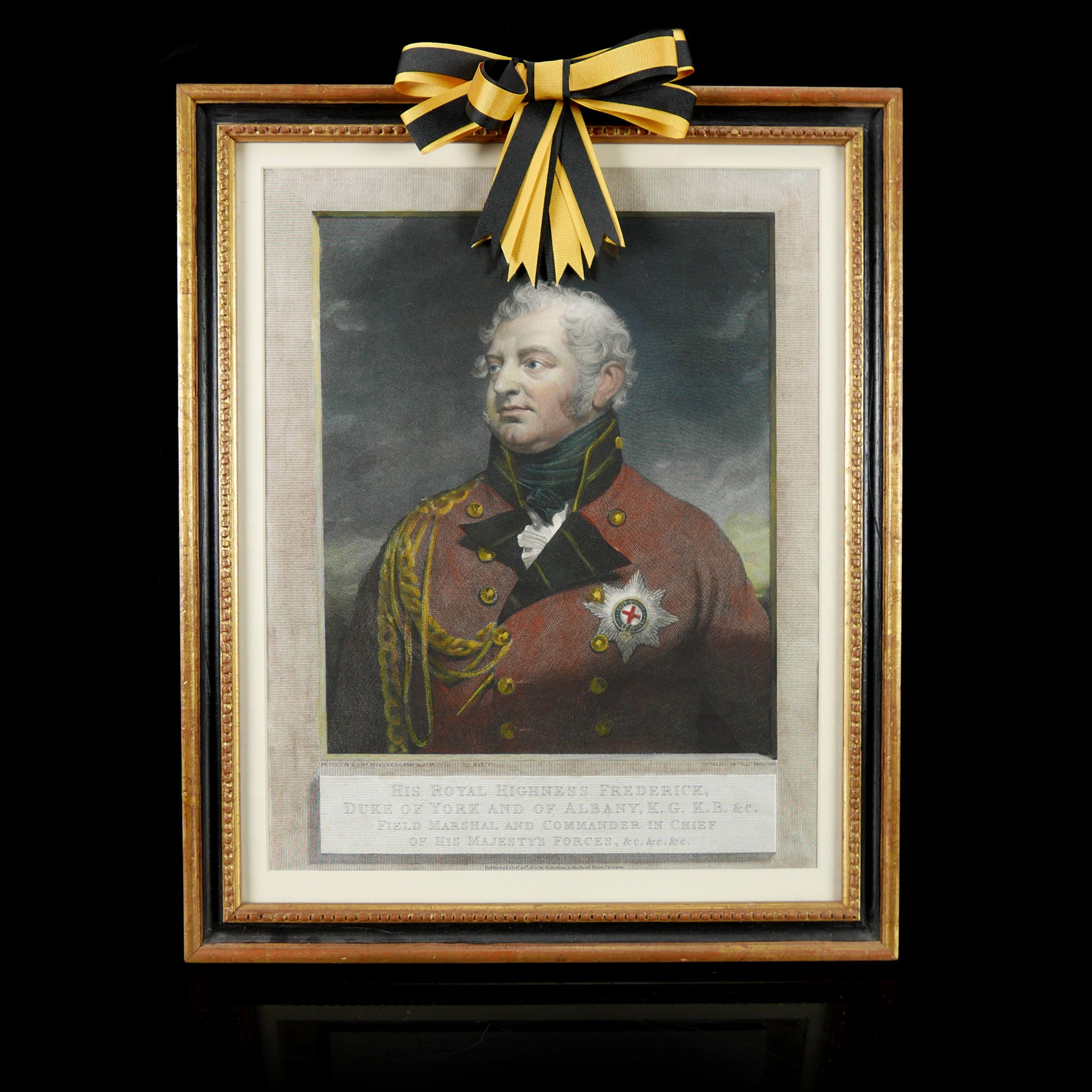 Line engravings. The first: hand coloured head and shoulders portrait of George III (1738-1820) as king with tied wig and bicorne, wearing the uniform of a General Officer and Garter star. After Beechey and lettered below image ‘His Most excellent Majesty / George The Third. / By The Grace of God of The United Kingdom / of Great Britain & Ireland , King, Defender of the Faith &c &c &c’, including publisher's details, 'Published Octr. 25th. 1812 by W. Skelton 1 Stafford Place, Pimlico’. The second: Hand coloured head and shoulders portrait of Frederick, Duke of York (1763-1827) wearing the uniform of a General Officer and Garter star. After Beechey and lettered below image ‘His Royal Highness Frederick, / Duke of York and Albany, KG, KB &c / Of His Majesty’s Forces &c &c &c including publisher's details ‘Published Octr. 25th. 1812 by W. Skelton, 1 Stafford Place, Pimlico.’ Framed and glazed.