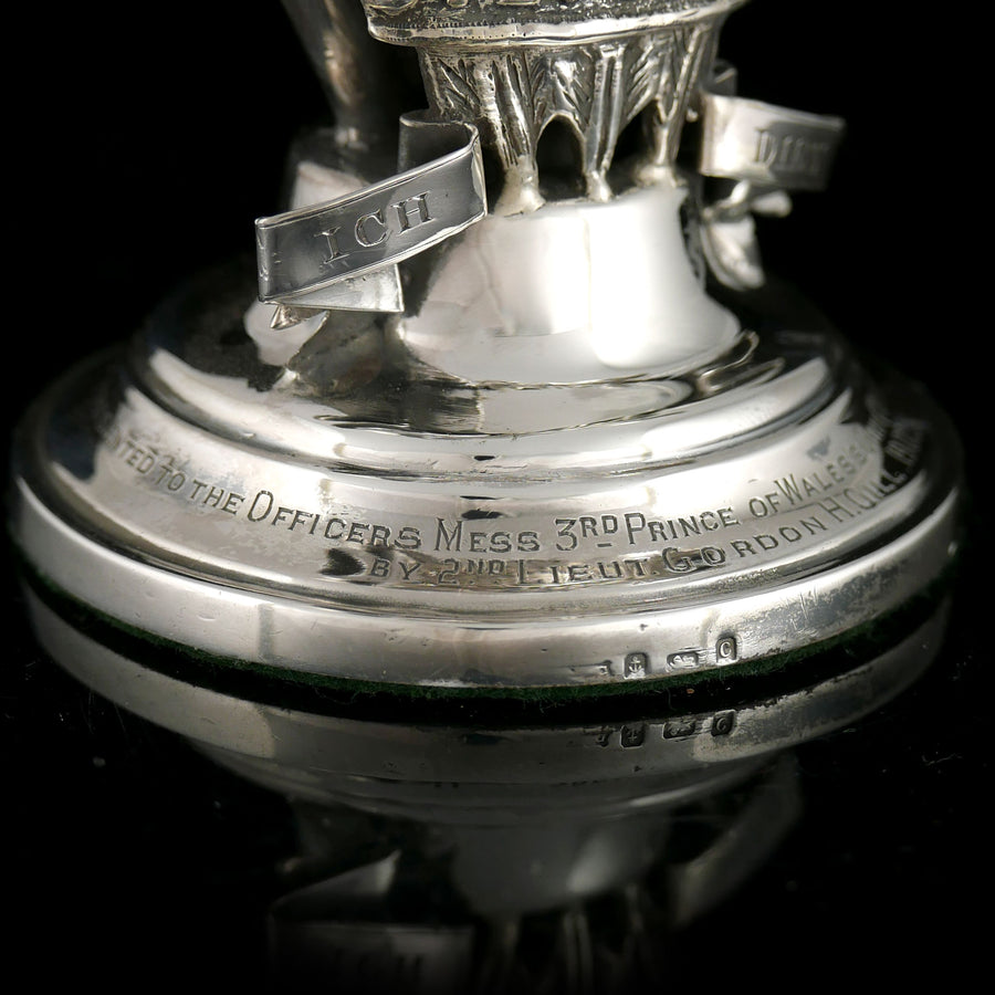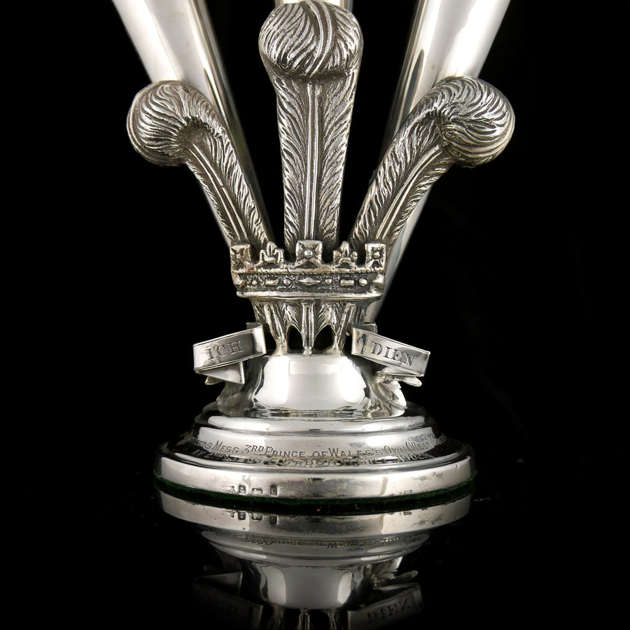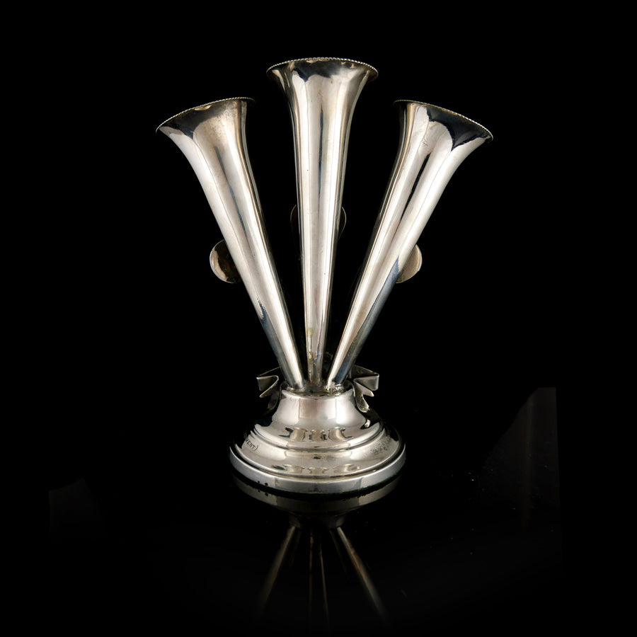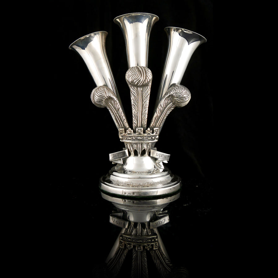 Weighted silver. An Edwardian triple bud vase on stepped circular base, mounted with the Prince of Wales’s feathers. The base inscribed 'Presented to the Officer's Mess 3rd Prince of Wales Own (West Yorkshire Regiment) by 2nd Lieut. Gordon H. Gill 1902’. Hallmarked 1902.
