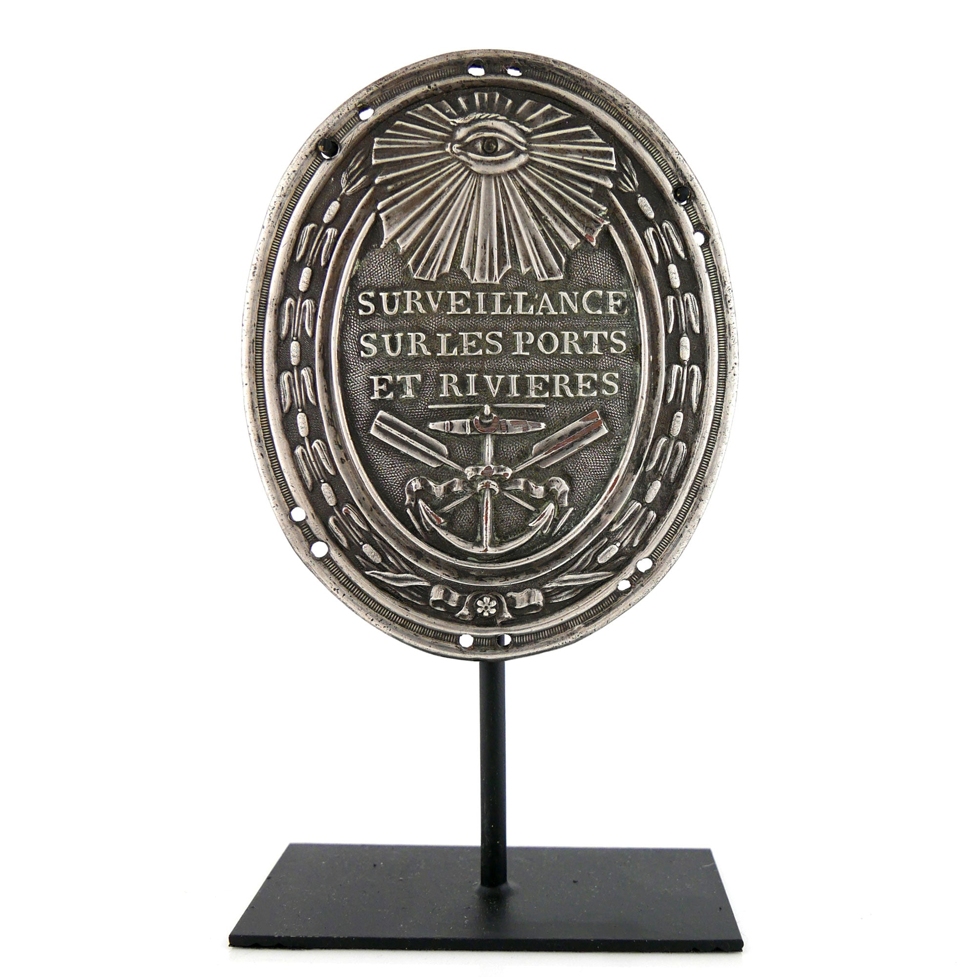 Silvered copper. Oval plate of the Commissaires de Surveillance sur les Ports et les Canaux, centrally impressed ‘SURVEILLANCE / SUR LES PORTS / ET RIVIÈRES’, beneath the Eye of Providence and over crossed oars and an anchor bound with ribbon, the whole contained within a border of reeds. 90 x 74 mm.