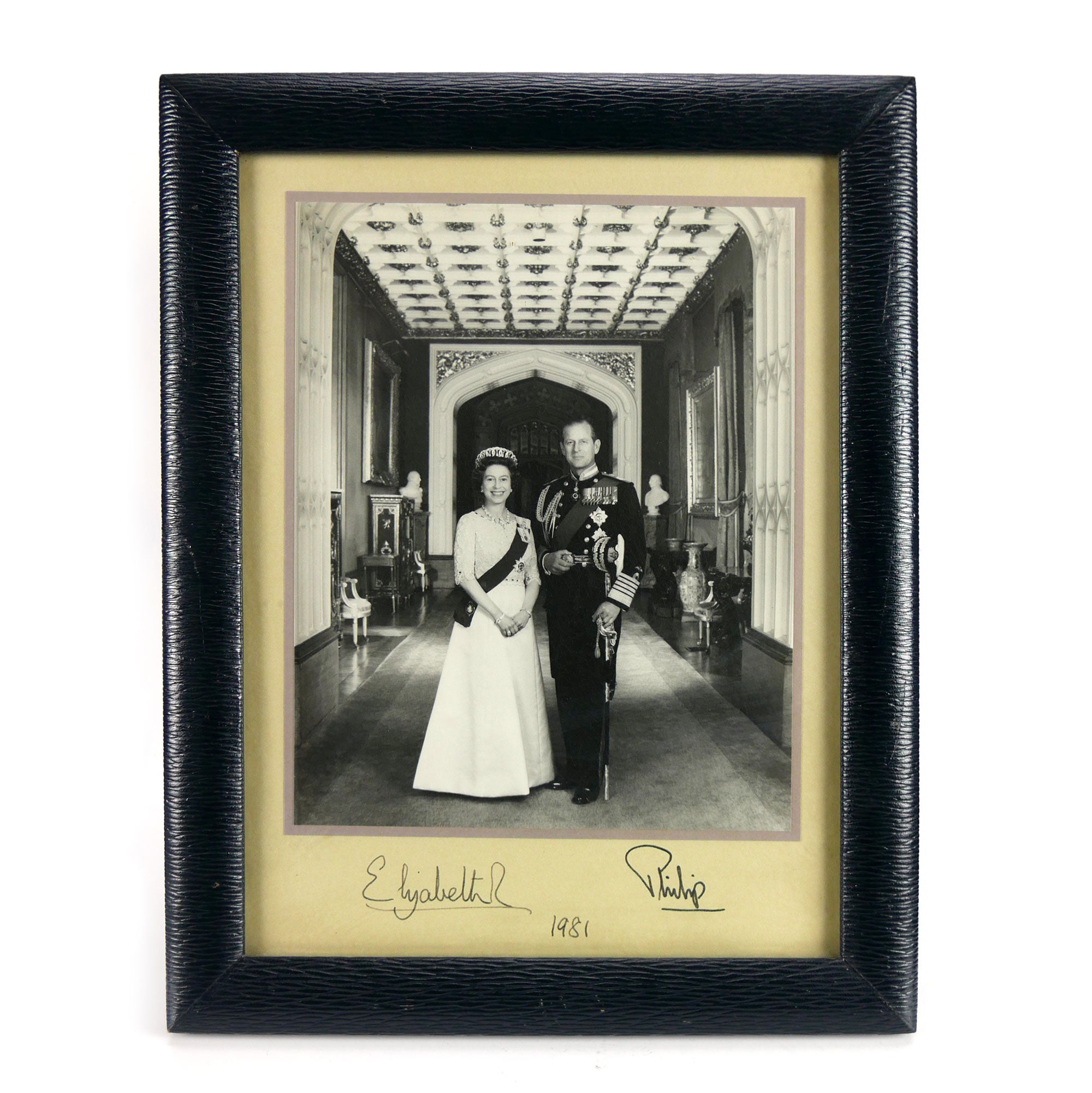 Black and white full length portrait photograph of the Queen Elizabeth (1926-2022) in state dress, Order of the Garter insignia and jewels, and Prince Philip, in the uniform of Admiral of the Fleet, photographed standing in the Grand Corridor at Windsor Castle. Signed and dated respectively in the lower mount ‘Elizabeth R / 1981’ and ‘Philip’. Contained in original easel backed blue morocco glazed frame by Longmire of St. James’s, London.