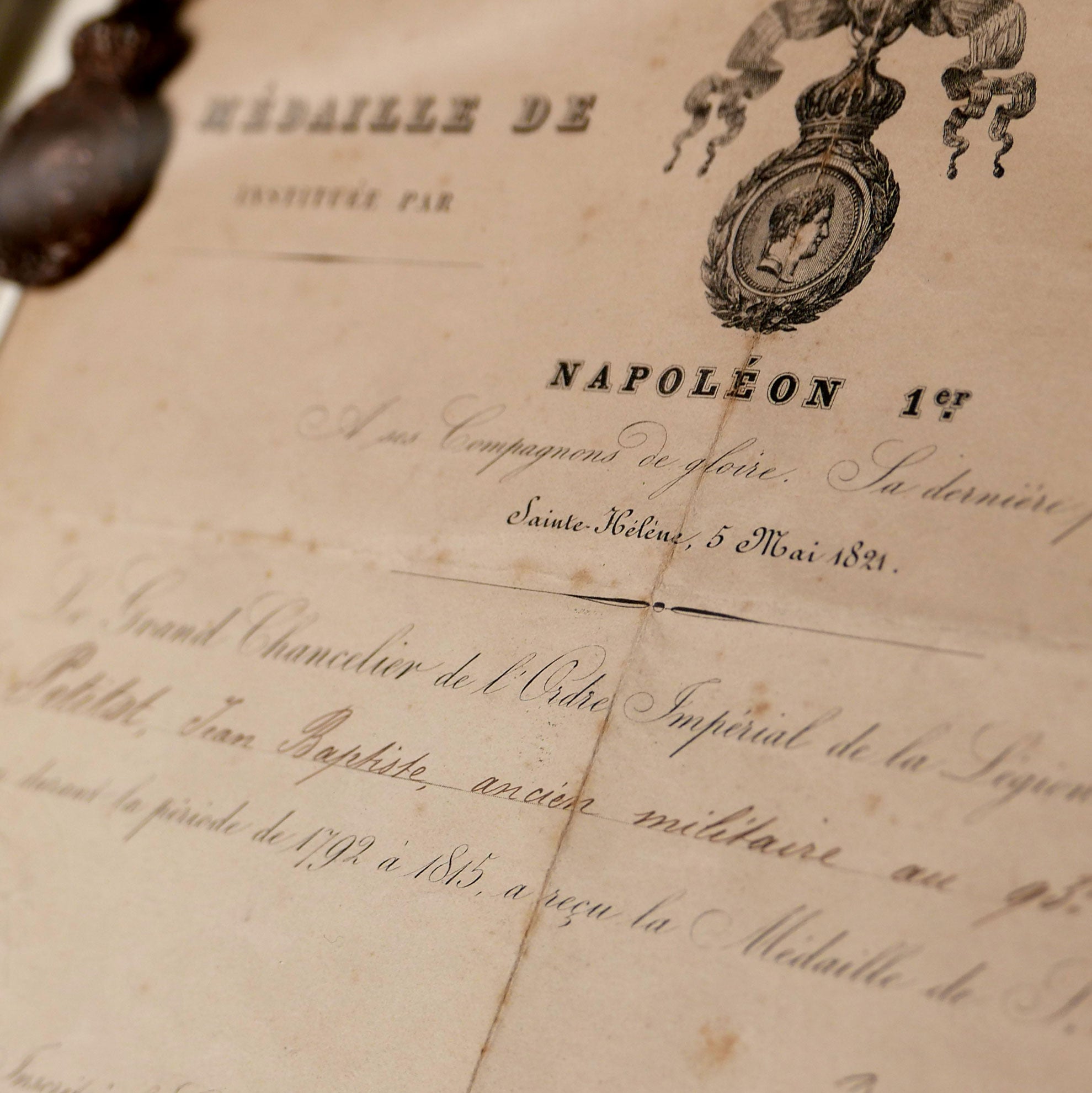 Engraved St Helena award document, no. 39190, to a veteran serviceman Jean Baptiste Petitot of the 93e Regiment de Ligne, together with a bronze St. Helena Medal. Framed and glazed.