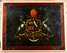 Oil on board. An armorial artist’s hand painted polychromed coach panel depicting the arms Alexander Edward Murray, 6th Earl of Dunmore (1804-1845) surrounded by the Motto scroll incribed ‘Furth Fortune’ (Go onward with fortune), framed and glazed back to back with an armorial panel displaying the arms, supporters and motto ‘Festina Lente’ (Make haste slowly) of William Conyngham Plunket, 4th Baron Plunket (1828-1897), Dean of Christ Church Cathedral and Archbishop of Dublin in the Church of Ireland.