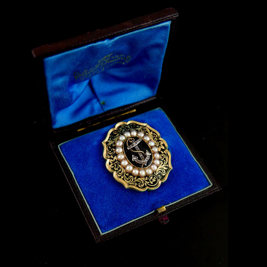 Obverse: gold and of half-arch and ogee border design containing gold foliate scrollwork set against a ground of black enamel centered on an oval panel of enamel surmounted by a diamond set fouled anchor within a border of eighteen pearls. Reverse: a glazed locket compartment containing a lock of hair, the gold border engraved ‘Rear Admiral John McKerlie’ / Died 12th Septr 1848. Aged 74 years’. Cased.