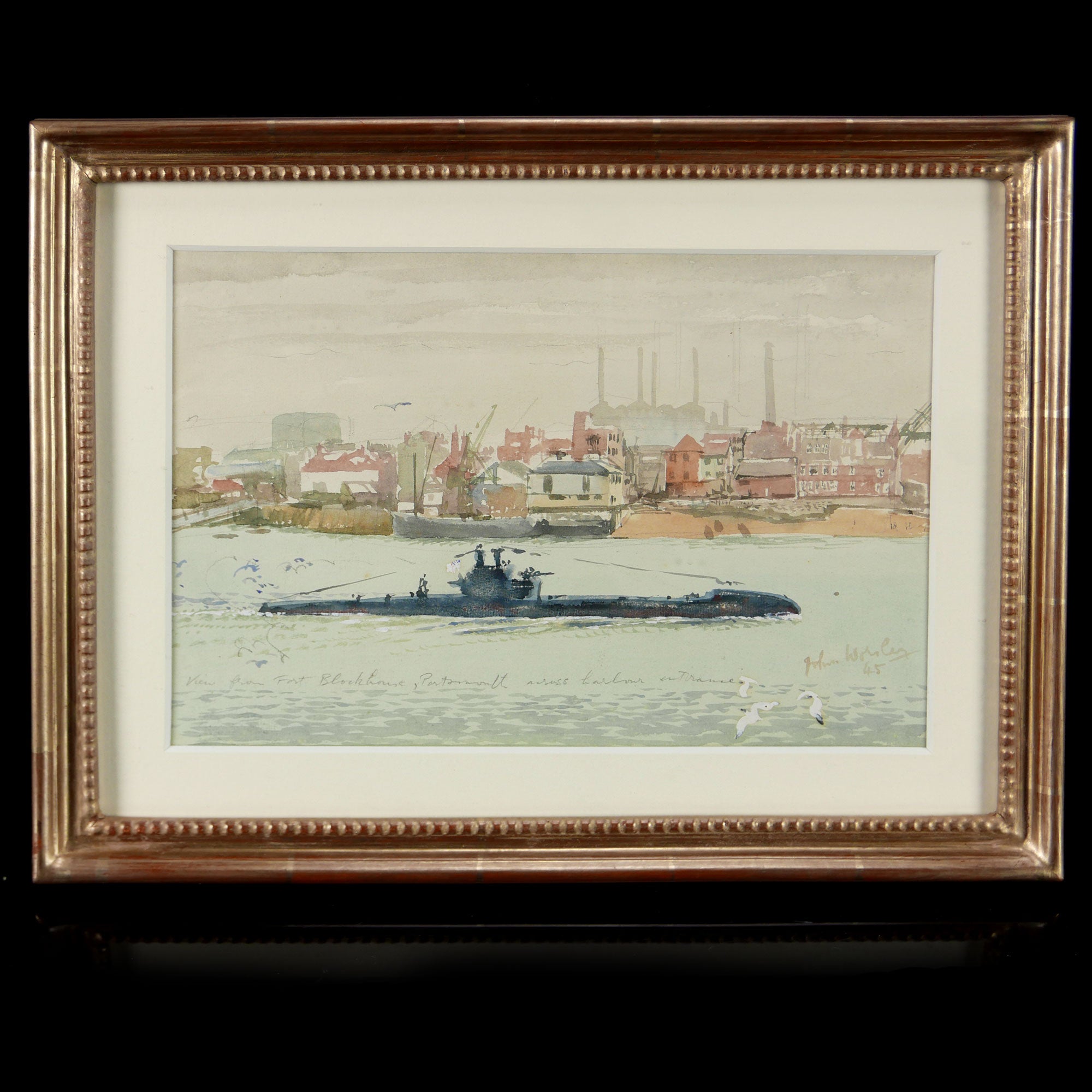 Watercolour on paper. A T-class submarine with Old Portsmouth in the background. Inscribed by the artist ‘View from Fort Blockhouse, Portsmouth  across harbour entrance’, and signed and dated lower right ‘John Worsley / 65’.