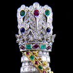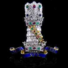 The crest of Saxony (Out of a coronet, a pyramidal chapeau charged with the arms of Saxony ensigned by a plume of peacock's feathers Proper out of a coronet) in white and yellow gold set with diamonds, rubies, emeralds, sapphires and enamel, over Prince Albert's personal motto in the German - 'Treu und Fest' (Loyal and Sure) in yellow gold and enamel.