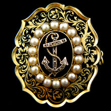 Obverse: gold and of half-arch and ogee border design containing gold foliate scrollwork set against a ground of black enamel centered on an oval panel of enamel surmounted by a diamond set fouled anchor within a border of eighteen pearls. Reverse: a glazed locket compartment containing a lock of hair, the gold border engraved ‘Rear Admiral John McKerlie’ / Died 12th Septr 1848. Aged 74 years’.