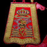 These 19th century accoutrements are in exceptionally good and complete condition. The pouch belt is of gold lace of regimental shamrock pattern on red cloth, the foliate design buckle and slider are of gilt metal, the foliate and crowned VR cypher terminal is similarly gilded. The pouch is of red moroccan faced with red cloth embroidered in gold and silver bullion wire with the Royal Crest, Harp and Maid, the regimental motto and eight battle honour scrolls. The fittings are of gilt metal. The sabretache is edged in gold shamrock lace enclosing a bullion embroidered Guelphic crown, motto scroll, VR cypher, the Royal Crest, Harp and Maid, over eight battle honours – ‘Leswarree’, ‘Hindoostan’, ‘Alma’, ‘Balaclava’, ‘Inkerman’, ‘Sevastopol’, ‘Central India’ and ‘Afghanistan’. The reverse and bag are in red moroccan, as are the foul weather, velvet lined, covers; the slings, complete with gilt lion mask buckles covered with regimental lace, and connect to the sabretache’s three ‘D’ rings.