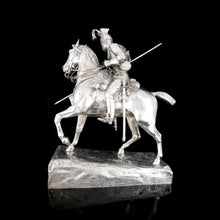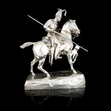 Silver and bearing the 1899 maker’s mark of the Goldsmiths and Silversmiths Company to the off-side fore hoof, and the lion passant and leopard’s head of the 1897 to 1915 London Assay Office silver hallmarking cycle. An identical model by the Goldsmiths & Silversmiths was presented the Officers of the 9th (Queen’s Own) Lancers to the Officers of the Cape Mounted Riflemen who served with them during the Boer War. Mounted on velvet covered plinth. Height including base: 38.5cm (15.15in).