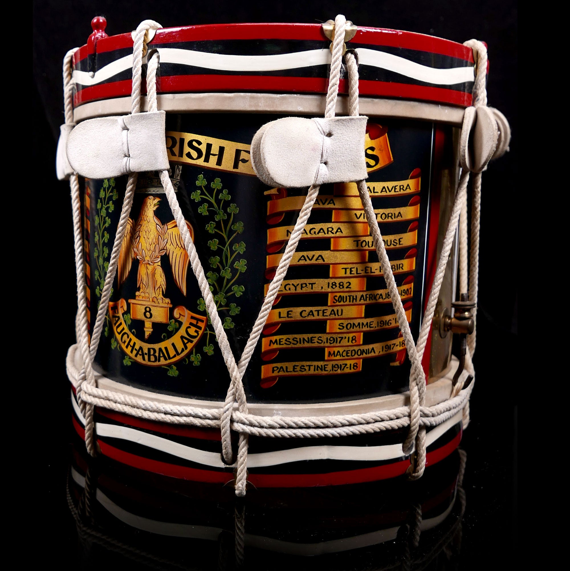 Painted wood hoops, rope tension system, brass cylinder, and hand painted regimental emblazon of the Barrosa eagle and war cry of the old 87th Regiment, and Battle Honours from ‘Monte Video’ to ‘Palestine 1917-18’. Cylinder stamped ‘George Potter & Co / Makers / Aldershot’.