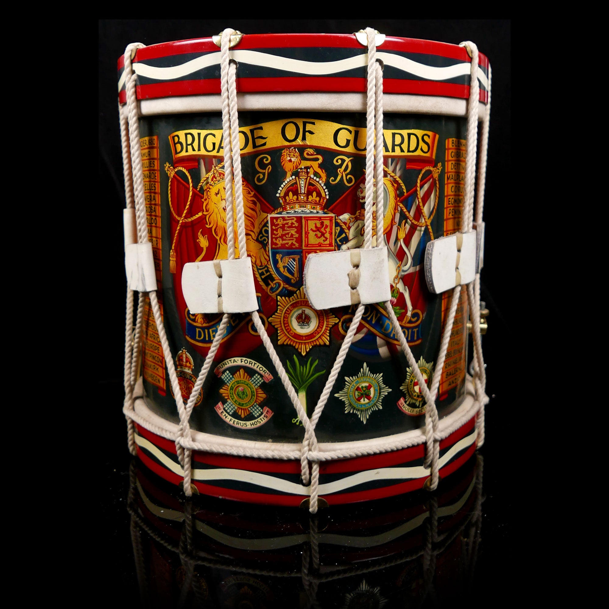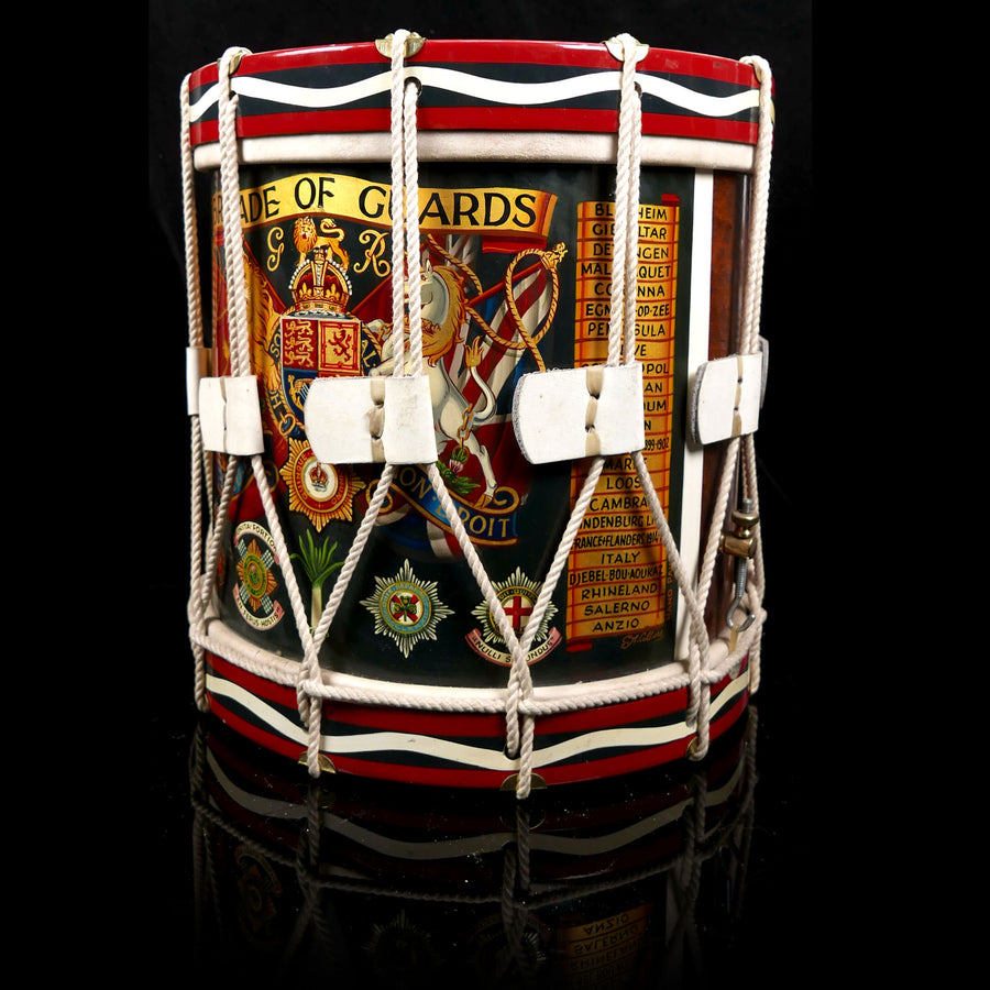 Hand painted wood hoops, rope tension system, wood cylinder and hand painted emblazon for the Brigade of Guards. A presentation drum with battle honours from Tangier, 1680 to Anzio, and fitted for use as a side table with glass top. Signed C.A. Collins