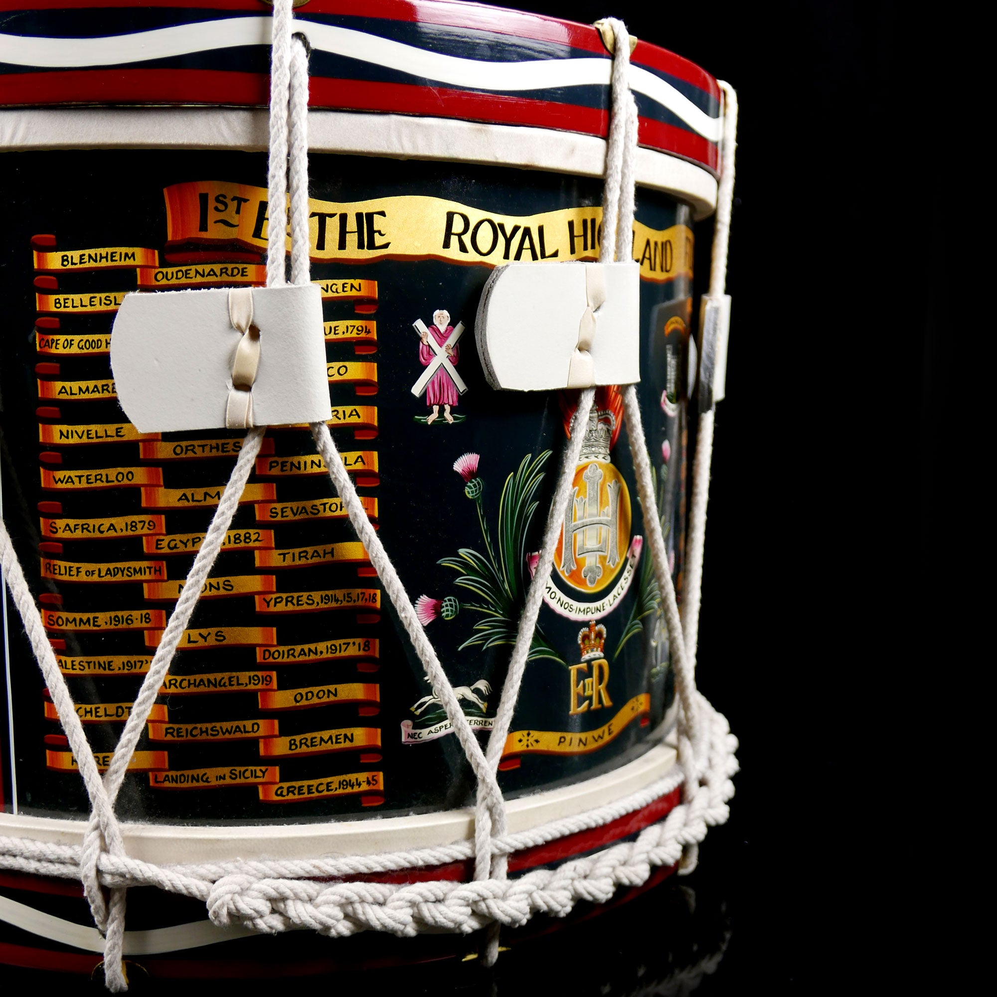 Wood cylinder rope tension tenor drum. Emblazoned with Royal Arms, EIIR cypher, flaming grenade with HLI monogram, regimental title and battle honours.
