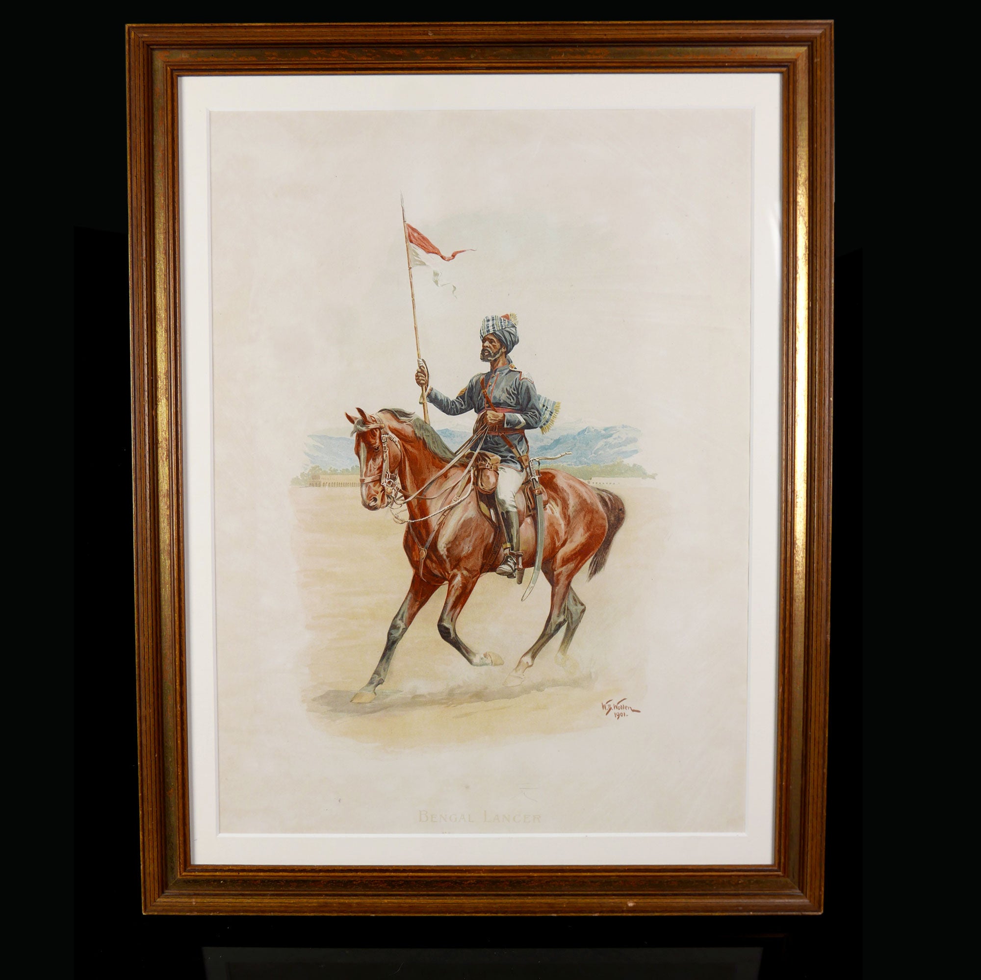 Coloured lithograph. A mounted Dafadar of the Bengal Lancers. After the battle painter William Barnes Wollen. Titled ‘Bengal Lancer’. Framed and glazed.