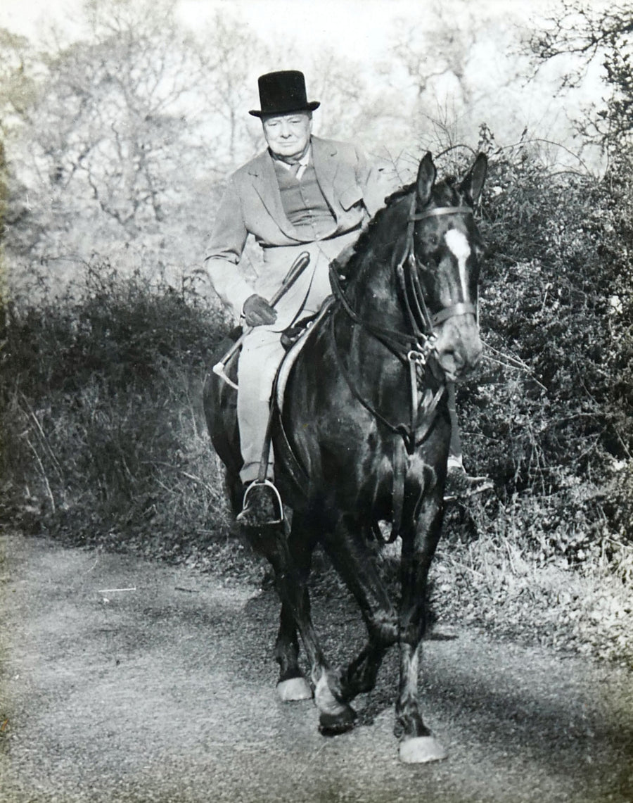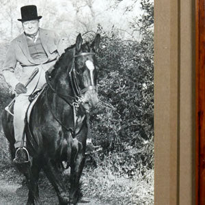 The period Associated Press photograph of the former cavalry officer and statesman was taken on the occasion of his 74th birthday while out hunting with the Old Surrey & Burstow near Chartwell Farm in 1948. At that time Clement Attlee’s Labour Government were trying to ban hunting with dogs, and Churchill displayed his opposition by borrowing a horse and joining a meet at Chartwell. A copy of this image hangs in the lower stairwell at Chartwell.