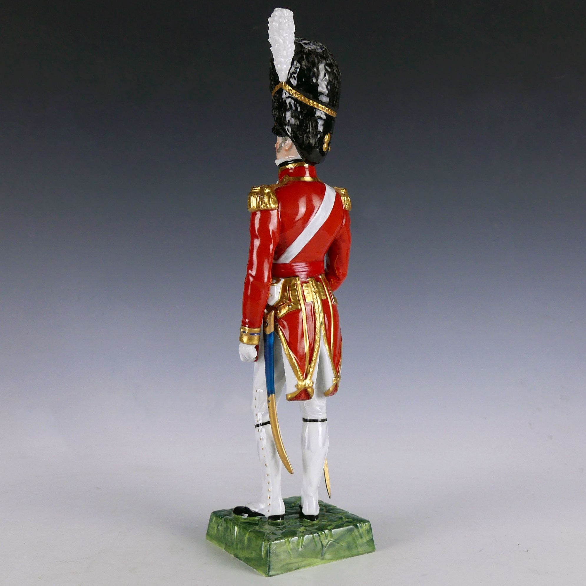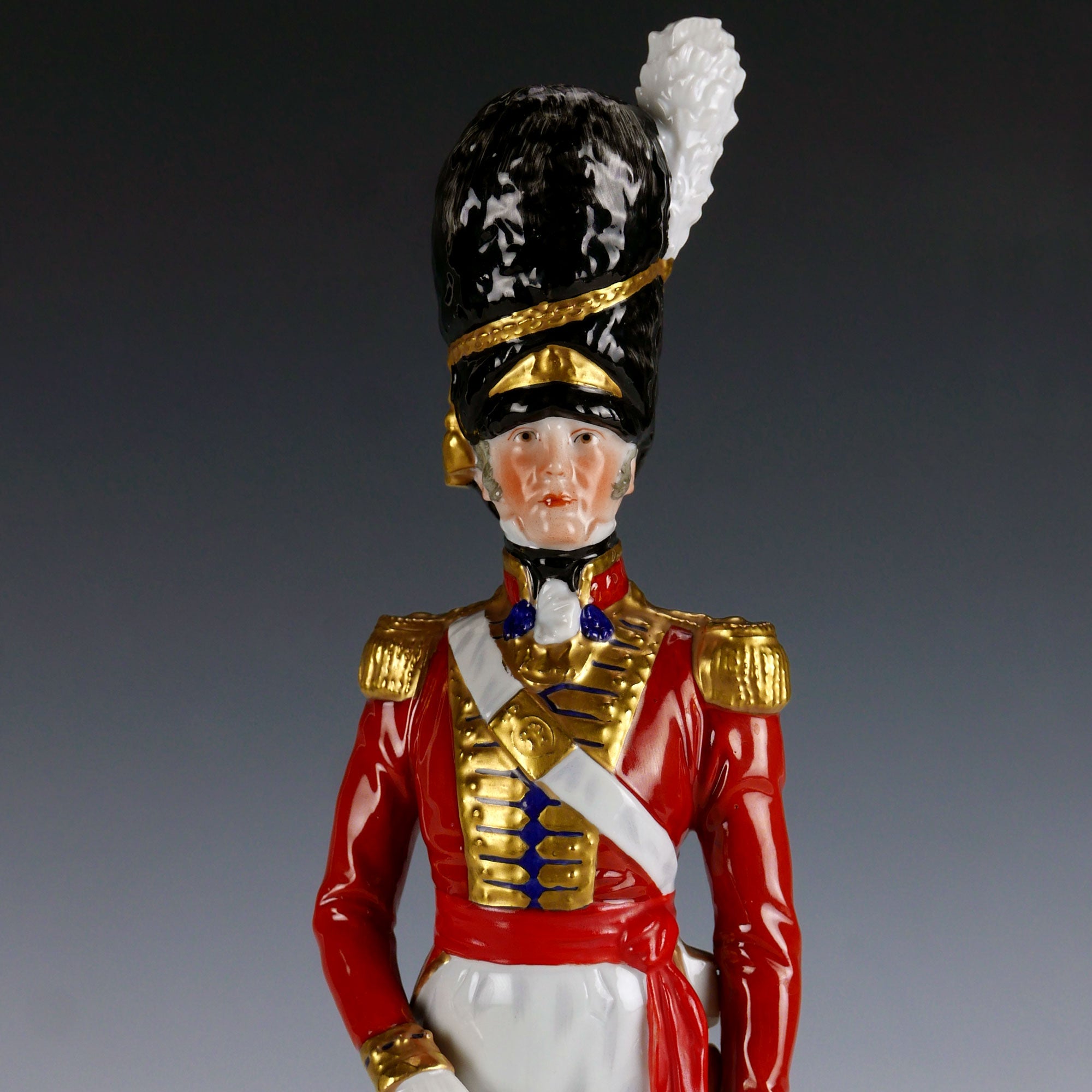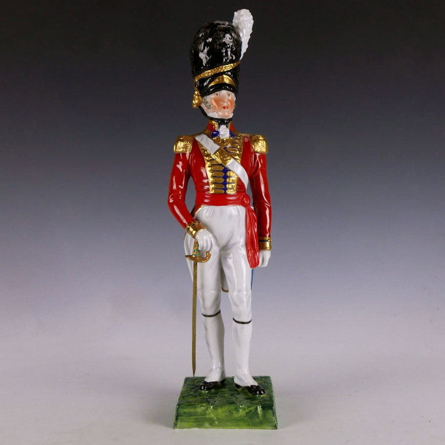 There appear to have been no additions to the military figures until 1929 when the factory's chief sculptor, Reinhold Braunschmitt introduced the series representing the uniforms of the three senior regiments of British Foot Guards from 1660 to 1930. It has been suggested that these figures were the result of a collaboration between Major E.G. Christie-Miller (1880-1967) and Karl August Kuntzsch’s two sons who succeeded him in running the factory in 1920. Christie-Miller was a Coldstream Guards officer with a strong sense of regimental tradition. He was a prisoner of war from 1914 to 18 and upon his release had been commissioned to tour the country and report on conditions in Germany. Accordingly his command of German allowed him to fully communicate his ideas to Braunschmitt and his superiors. The results of their efforts were a fine range of Guards figures for retailer Fortnum & Mason, which may be seen as the high water mark of their military figure production.