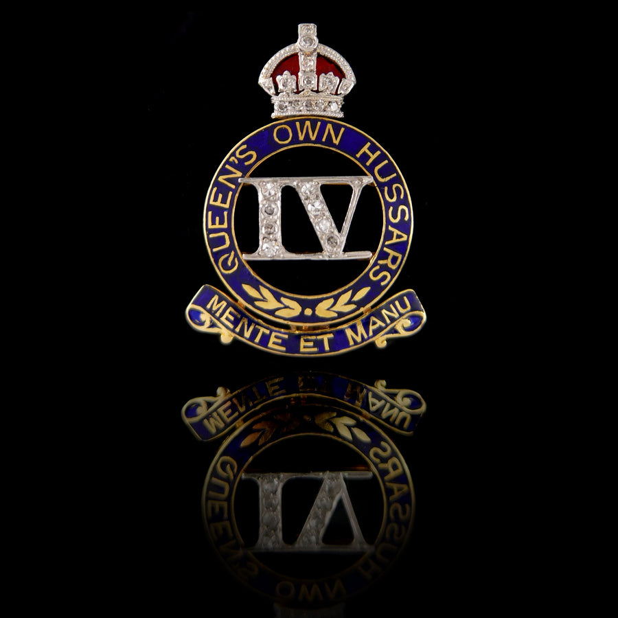 The Roman numeral IV in white gold pavé set with eight cut diamonds within a gold circlet inscribed with the regimental title, over the motto ‘Mente et Main’ (With might and main) in yellow gold and blue enamel, the whole ensigned with the King’s Crown in white gold set with diamond and enamel. Cased.