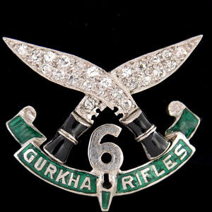 White gold crossed the blades set with eighteen rose-cut diamonds and handles enamelled black, above numeral ‘6’ in white gold over a green enamelled titled scroll.