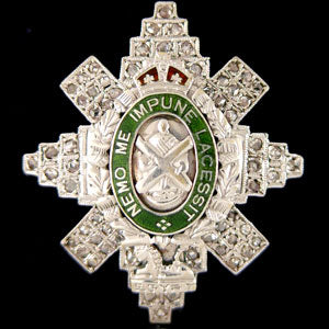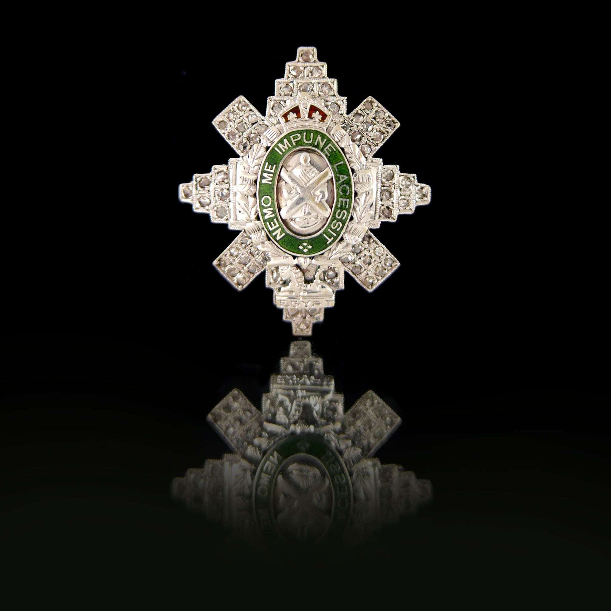 Star of the The Order of the Thistle in white gold set with diamonds, radiating from a thistle wreath in white gold encircling a green enamel motto circlet inscribed ‘Nemo me impune lacessit’ (None Attacks Me With Impunity) ensigned with the King’s Crown, and containing the figure of St. Andrew.