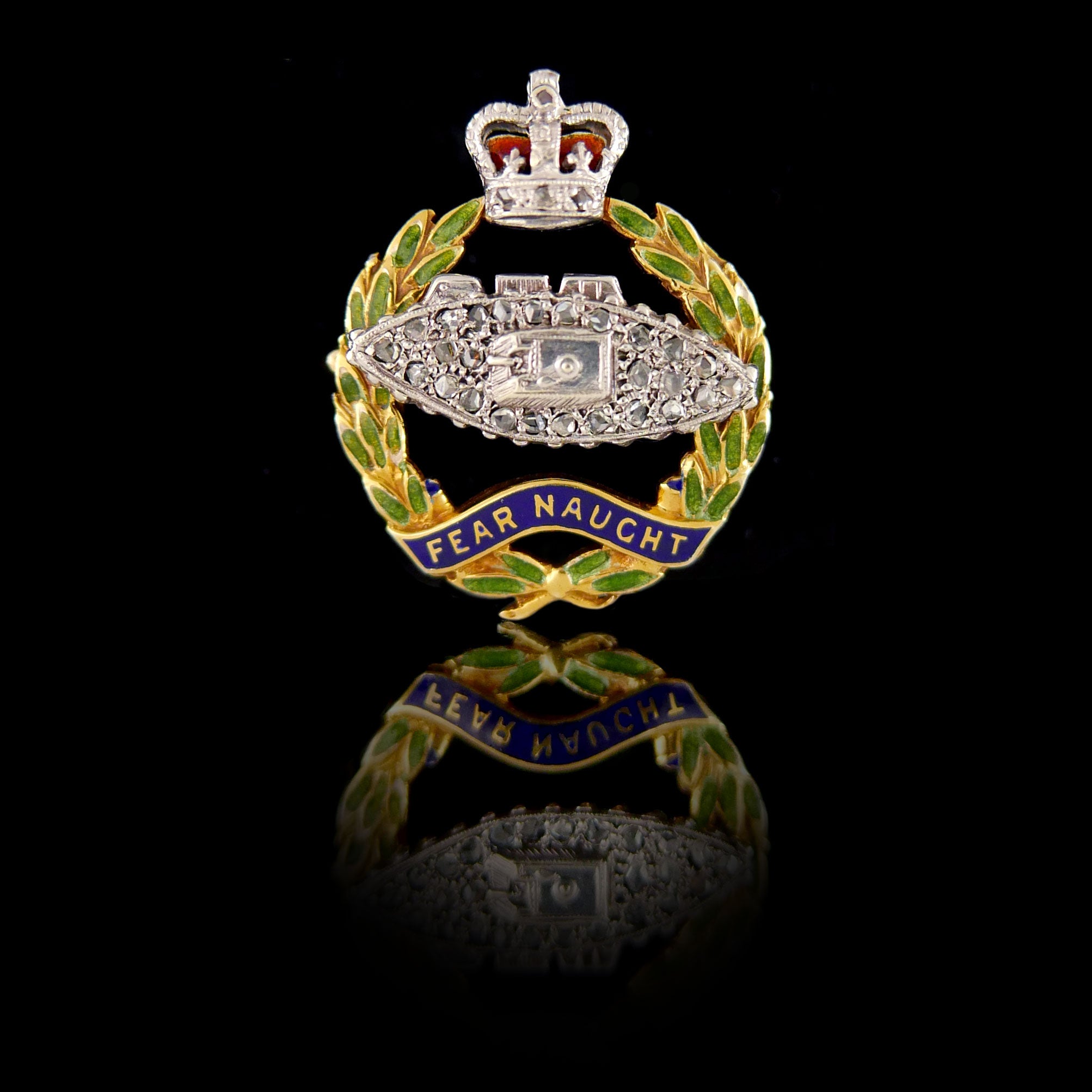Garrard & Co., an enamel and diamond regimental brooch, circa 1987, depicting the badge of the Royal Tank Regiment with their motto 'FEAR NAUGHT', applied with enamels and set with rose-cut diamonds, mounted in bicoloured 9ct gold, length 2.5cm, British hallmarks, sponsor's mark for Garrard & Co., gross weight approximately 4.5 grams, fitted case stamped Garrard & Co.