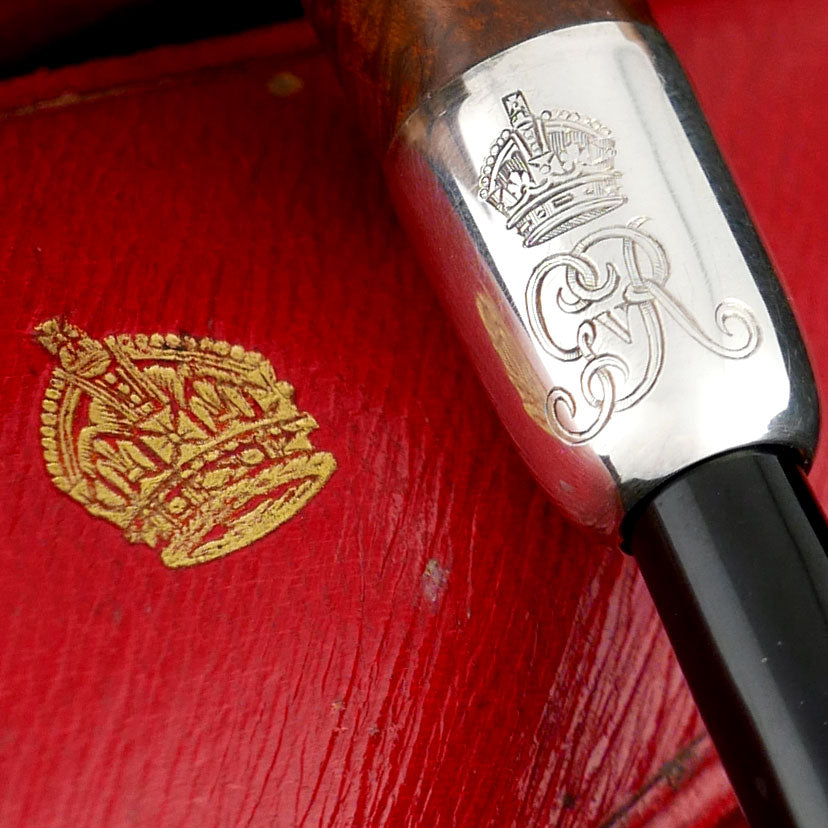 Royal presentation briar pipe, the bowl with silver mounted socket, engraved with the ‘GVR’ monogram of King George V, reigned 1910-36) with detachable fishtail stem. Contained in its original red Morocco case gilt embossed with the State Imperial Crown by the royal warrant holder Alfred Clark of New Bond Street, London.