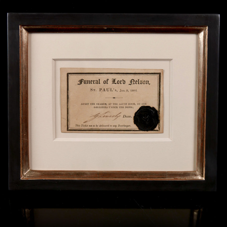 Printed card with inked inscriptions and wax seal of the Dean and Chapter of St Paul’s. Ticket for the ‘Funeral of Lord Nelson / St Paul’s, Jan.1806’ to ‘Admit the bearer at the North Door’. Additionally annotated in the 19th century hand of chorister ‘J.M.’. Signed by the Right Reverend Sir George Pretyman Tomline, Bt, FRS, Bishop of Lincoln (1750-1827) in his capacity as Dean of St. Paul’s Cathedral. Ticket: 7.5cm x 12cm,