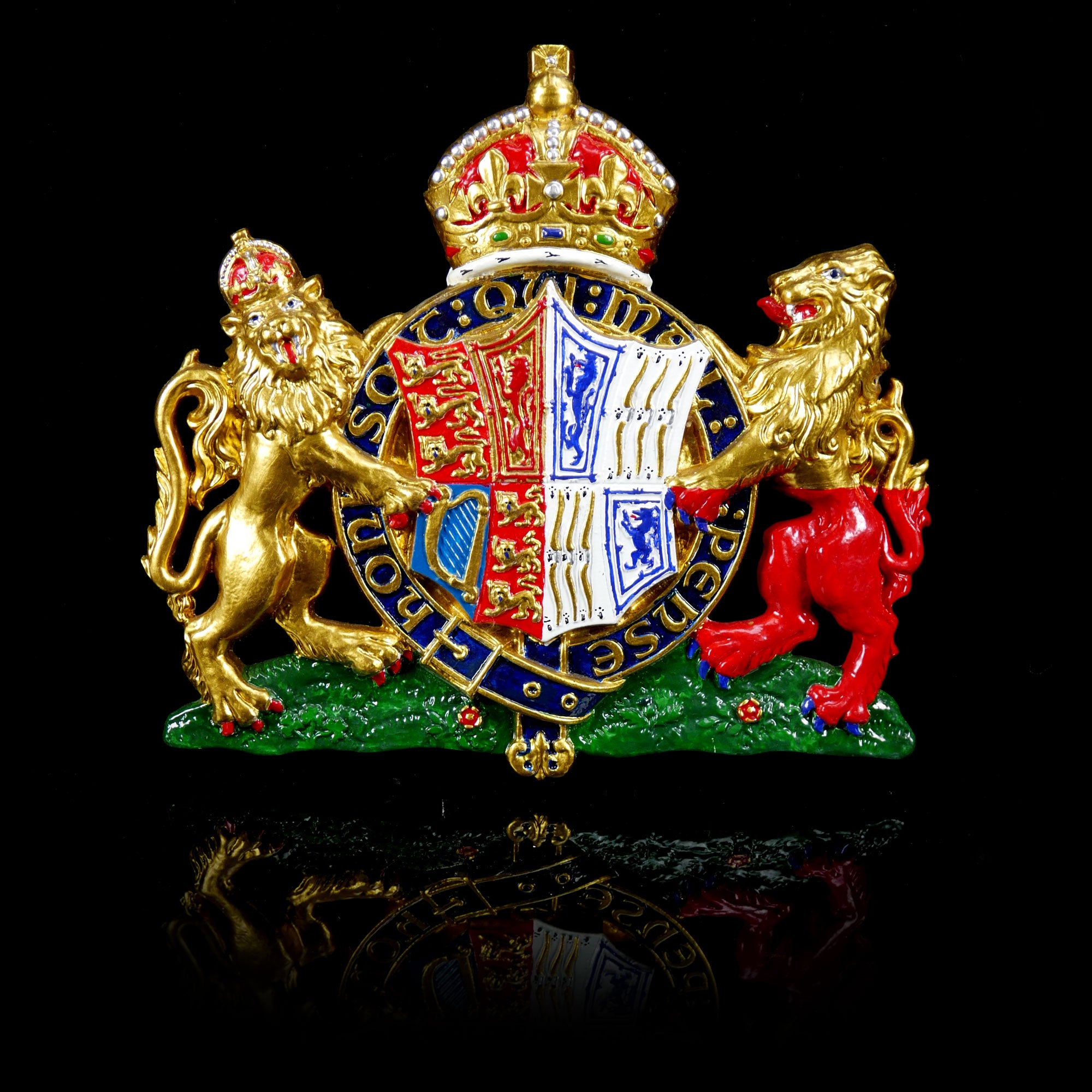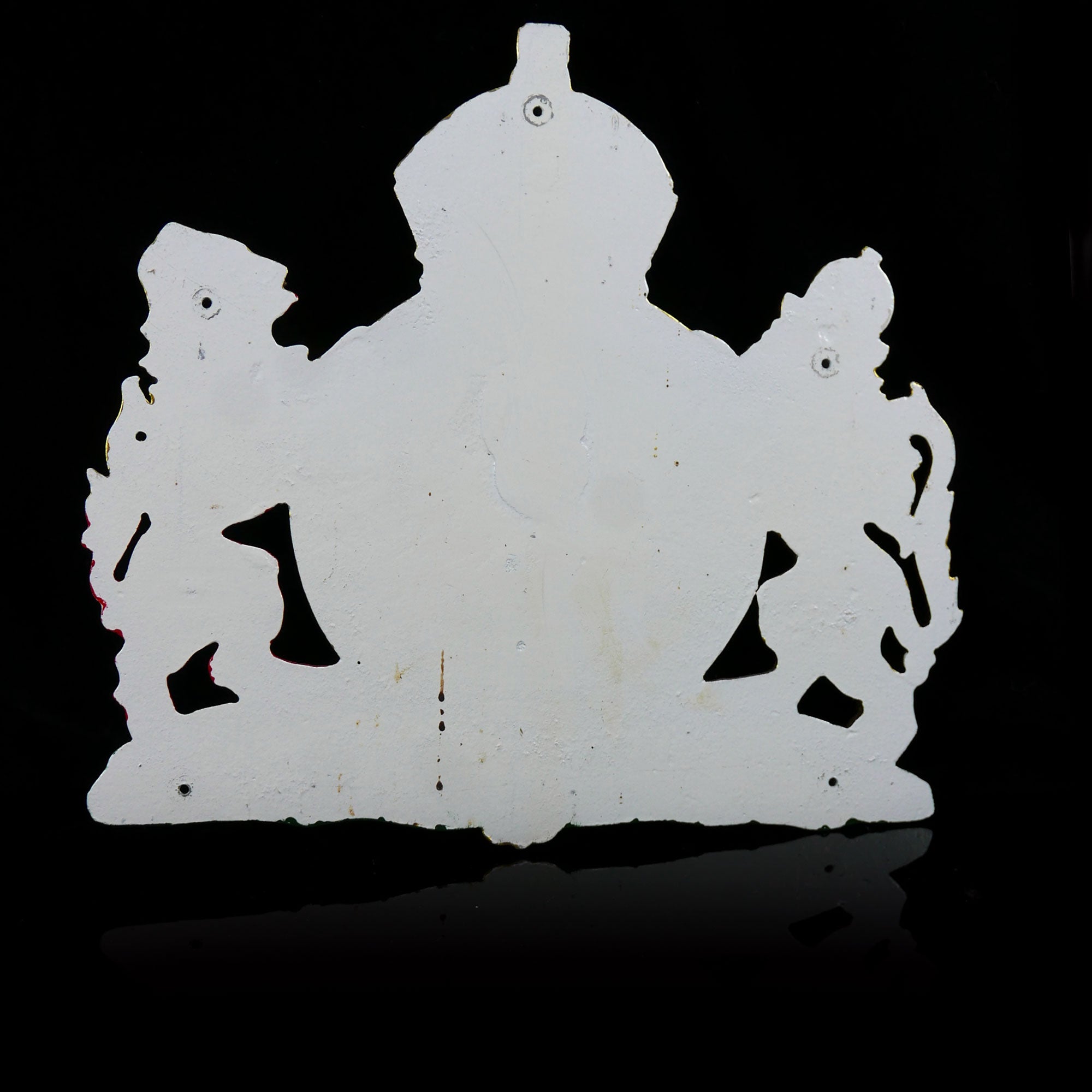 Polychromed cast metal. Royal warrant holder’s appointment sign for Queen Elizabeth, The Queen Mother (1900-2002) being the arms of Elizabeth Angela Marguerite Bowes-Lyon, Queen consort of the United Kingdom and the British Dominions, Empress of India from 1936-1952, granted in 1936 after the accession of her husband Albert, Duke of York as King George VI. The Queen continued to use the coat of arms as Queen Elizabeth, The Queen Mother until her death in 2002 - viz: The Royal arms, impaling, quarterly, First and Fourth, Argent, a lion rampant Azure armed and langued Gules within a double tressure flory counter-flory of the second (For Lyon); Second and Third, Ermine, three bows, strings palewise Proper (For Bowes), the whole surrounded by the Garter; for a Crest, the imperial crown Proper; for Supporters, dexter a lion rampant guardant Or, imperially crowned Proper, sinister, a lion per fess Or and Gules; in the compartment below the shield, with the Union rose, shamrock and thistle engrafted on the same stem.
