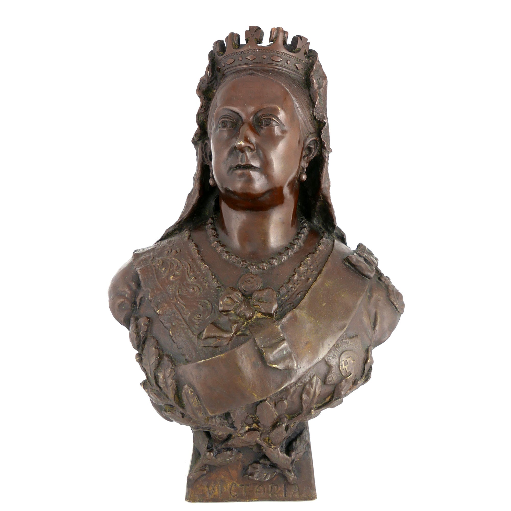 Patinated bronze. Queen Victoria wearing a widow’s veil, sash and star of the Order of the Garter, Sovereign’s badges of the Order of Victoria and Albert. Raised on a integral tapering base modeled with oak and laurel branches.