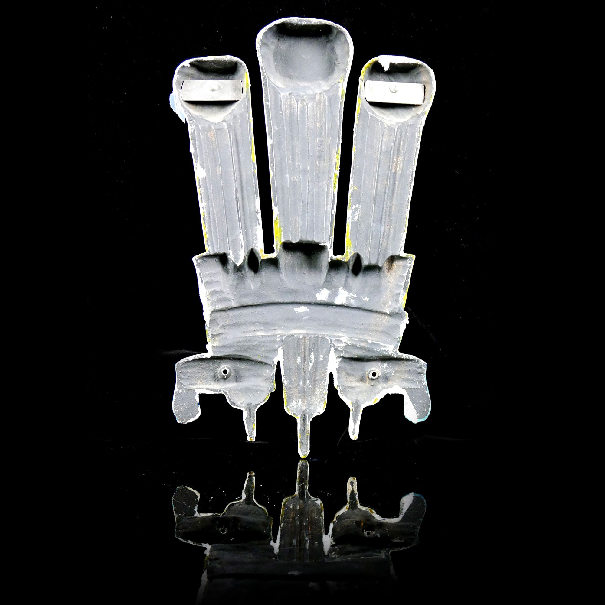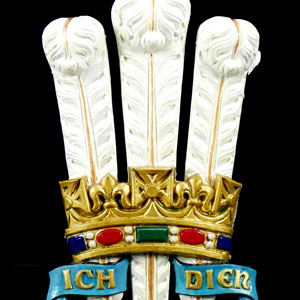 Polychromed cast metal. Edwardian Royal Warrant Holder’s Sign in the form of the Prince of Wales’s feathers for George, Prince of Wales (later George V, reigned 1910-36), bearing the motto ‘Ich Dein’ (I serve).