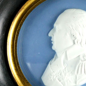 Sèvres bisque head and shoulders low relief profile portrait Louis XVIII, facing left, wearing the Star of the Order of the Saint-Esprit, modelled by Alexandre Brachard, and incised 'Sèvres' and 'Brachard F[ecit]’ on the truncation. On a circular form blue wash ground, and contained within contemporary glazed gilt-metal and ebonised frame.