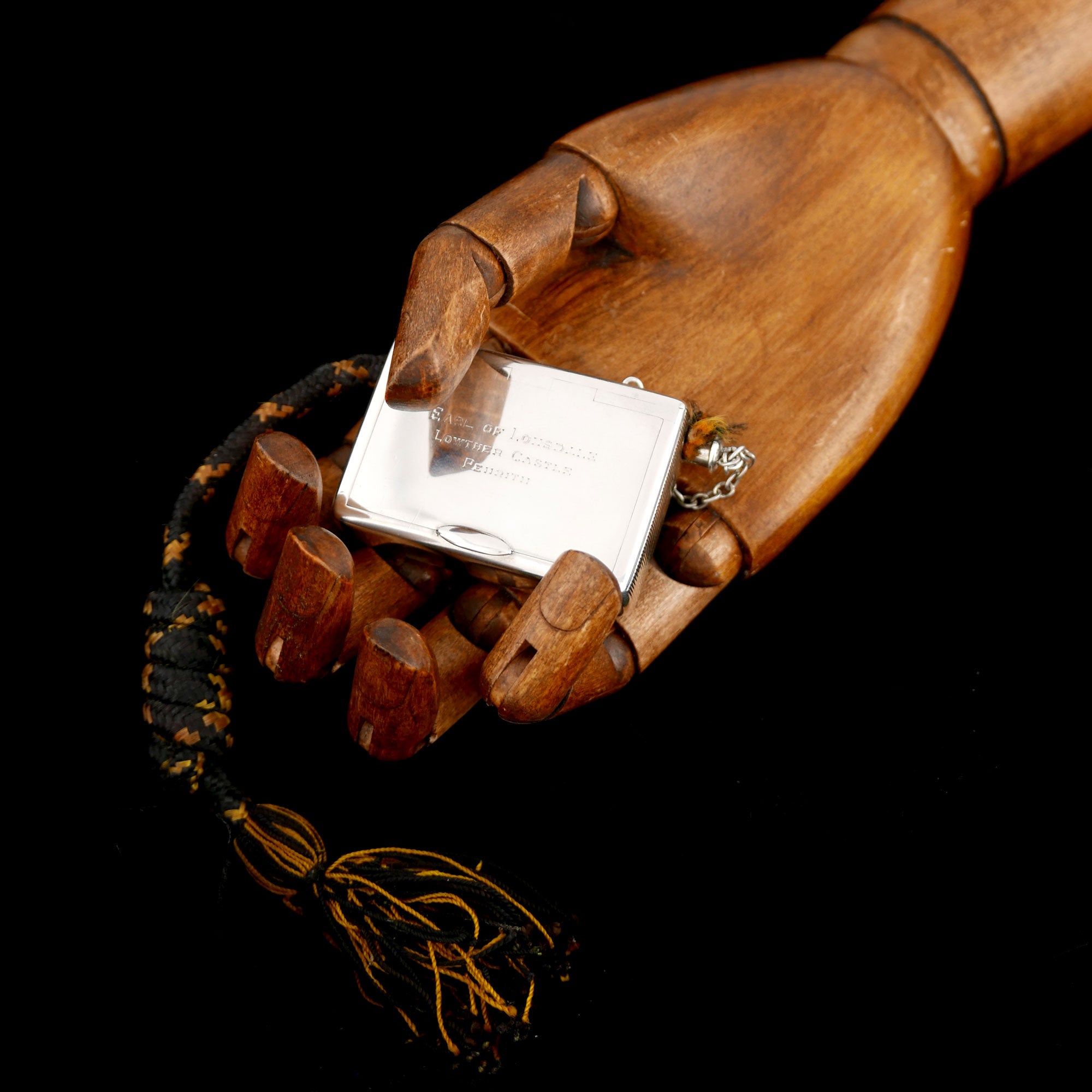 Silver. Edwardian vesta with tinder-cord, the hinged cover engraved 'Earl of Lonsdale Lowther Castle Penrith', one end with a strike plate. Maker’s mark of William Frederick Wright. Hallmarked  London, 1903. Cased,