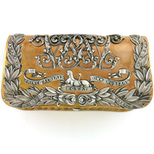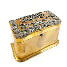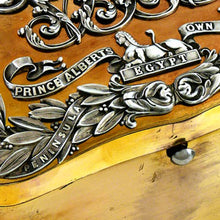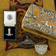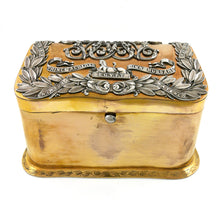 Silver, polished brass, gilt metal and silk. An 11th Hussars officer’s 1840-55 pattern pouch flap, with applied reversed VR cypher surmounted by the light cavalry or Guelphic crown, bounded by a laurel-wreath border entwined with Battle Honours scrolls for Salamanca, Bhurtpore, Peninsula and Waterloo, and the regimental title scroll in base with centrally applied Sphinx over the Egypt plinth, all in silver, forming the hinged lid to a bespoke table top box of similar contour, with push catch opener, flared foot with engraved foliate decoration, the interior lined with watered silk of 'Cherry Pickers’ hue.