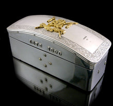 A regimentally specific Victorian cavalry officer’s pouch flap hallmarked Birmingham 1886 by Joseph Jennens & Co., converted for use as a trinket box by London silversmiths William Gibson and John Langman; the base bearing hallmarks for London 1898, and further applied with the dates 1875-1890.