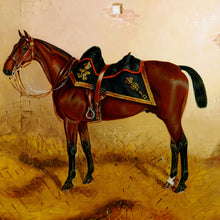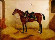 Oil on canvas. Equestrian portrait of a chestnut charger equipped with the full dress horse furniture of the Royals for the period 1883-1896, comprising hunting pattern saddle with regulation blue girth over Ukrainian black lambskin edged in regimentally specific red scalloped cloth, over the dragoon style shabraque of authorised pattern, being bullion embroidered with the Guelphic crown, Royal crest encircling Garter and designation ‘1’ ‘D’ at the hindquarters and crowned VR cypher at the forequarters covering the wallets, complete with officers’ pattern bridle fitted with regimental ear and bit bosses, and head chain; set in a stable with horse blanket left initialled ‘BM’, indicating the ownership of Captain John Francis Burn-Murdoch, Adjutant, 1st (Royal) Dragoons. Inscribed verso, ‘’The Butt’ January, 1884’. Canvas size: 46cm (18in) x 61cm (24in). Contained in gilt wood frame