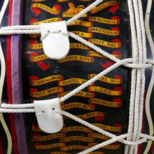 With painted ash hoops, rope tension system, wood cylinder, and hand painted regimental emblazon comprising title scroll, EIIR cypher, Royal arms and motto, and Star of the Order of the Thistle, ‘Unita Fortitor’ motto, and Battle Honours from Namur 1695 to Italy 1943-45. The cylinder’s interior pasted with maker’s labels of Henry Potter & Co. of Charing Cross with instructions for Drummers for ‘Lapping Drum Heads’.