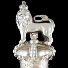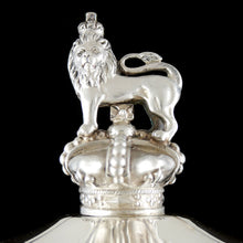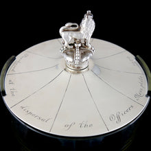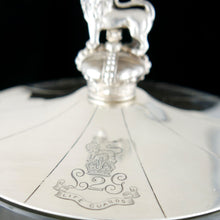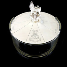 Silver and glass. Cylindrical body with silver lift off lid engraved with regimental cypher and badge, and applied with a central finial in the form of the royal crest being the badge of 2nd Life Guards (the imperial crown proper, thereon a lion statant gardant or imperially crowned prope). The lid further and additionally inscribed 'Purchased at the disposal of the Officers Mess plate 1929’. Gilt underside. Maker’s mark of the Crown Jeweller R & S Garrard & Co (James Garrard). Hallmarked London 1882.
