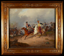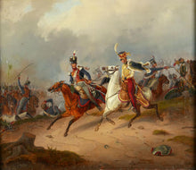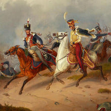 The present battle scene depicts the capture of a French Aide-de-Camp at the Battle of Waterloo by a Trumpeter Louis Zeitz of the 2nd Light Dragoons of the King’s German Legion. Identifiable from the crimson regimental facings, Roman numeral II on the shrabraque, and trumpet slung across the protagonist’s back, the scene is a direct visualisation of the act of gallantry cited by Trumpeter Zeitz’s commanding officer in 1819 for the award of the Guelphic Medal for Bravery.