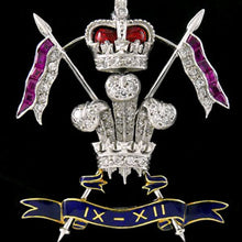 White gold, diamond set Prince of Wales’s feathers over crossed lances, the pennants set with rubies ad diamonds, ensigned by a Queen’s crown in white gold, diamond and enamel. In base the title scroll in yellow gold and blue enamel, inscribed ‘IX - XII’.