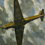 The title of the present work reveals Beresford’s Fairey Battle belonged to 142 Squadron which arrived at R.A.F. Binbrook, Lincolnshire on 3 July 1940 having sustained heavy losses in the Battle of France as part of the Advanced Air Striking Force. Powered with the same Rolls-Royce Merlin engine as the Spitfire and Hurricane, the Battle was disadvantaged by the weight of a three man crew and a bomb load that made it easy prey for Luftwaffe fighters and anti-aircraft fire. In answer to the Blitzkreig in the west in May 1940 the Battles of A.A.S.F. were called upon to perform unescorted low-level attacks against the German advance. In the first of two sorties carried out by Battles on 10 May 1940, thirteen out of 32 aircraft were lost. Next day in a another R.A.F. sortie against a German column, only one Battle out of eight survived. Losses in excess of 50 percent of Battles per mission were not infrequent. On 12 May a formation of five Battles from 12 Squadron tried to halt the German advance by attacking two road bridges over the Albert Canal. Four of the five Battles were destroyed while the final aircraft crash-landed upon its return to its base. Two Victoria Crosses were awarded posthumously for the action. Following 142 Squadron’s withdrawal to the England, it received more Battles in spite of their glaringly obvious obsolescence and flew sorties against German invasion barges being assembled on the French coast. In November 1940 the squadron received the first of its replacement Vickers Wellington heavy bombers and left Binbrook for R.A.F. Waltham on the 26th. By the end of 1940 the Battle had been withdrawn from front-line squadrons and relegated to training units overseas.