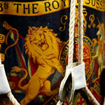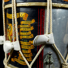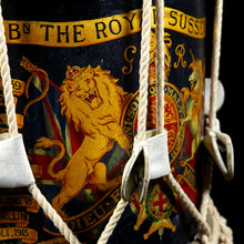 With painted ash hoops, rope tension system, drag ropes, and aluminium cylinder emblazoned with the Royal arms over the Maltese cross centred on the Garter and St. George’s cross superimposed on the the Roussillon plume, and Battle Honours to the end of the First World War - the hot weather foreign service aluminium cylinder stamped with the Royal arms ‘George Potter / Makers / Aldershot’. The emblazon vertically signed ‘Heraldry by Henry Potter & Co., of 36/38 West St., Charing X Road, London.’