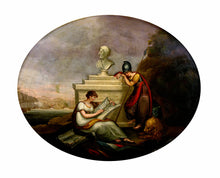 To the distant left British warships break the enemy line, while in the foreground lie the French Tricoleur and Spanish ‘la Rojigualda’. To the right a forest of English oak looms over Nelson’s tomb on which the figure of Britannia mourns with a lion couchant at her feet referencing British valour. Britannia further rests on a spear as she is yet to be equipped with the Union Jack shield and trident long afterwards synonymous with British naval supremacy. To the left of the tomb the female figure of Victory, fashionably clad in classically inspired dress, pens an epitaph in a book - ‘His Dauntless Bosom met the fatal Ball and Victory Mournd [sic] her Hero 21 October 1805’. A second memorial tome at Victory’s feet, held open by a fanfare trumpet and wreath of victor’s laurels, reads ‘After a series of Transendent [sic] and Heroic Servises [sic] this Gallant ADMIRAL FELL Gloriously in the moment of Brilliant and Desisive [sic] VICTORY / over the Combined Fleets of France and SPAIN off Cape Trafalgar in the 47 [th] year of HIS AGE’.